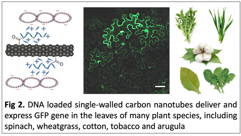 Motivated by this challenge, we addressed the plant biomolecule delivery problem by leveraging advantageous properties of nanoparticles, specifically single-walled carbon nanotubes (SWNTs). SWNTs are fully made of carbon and shaped into a long hallow cylinder. This nanocylinder of 1 nm in diameter and ~600 nm in length was optimally small enough to transport across the plant cell walls and at the same time had enough surface area to carry large biomolecules on it into the cells. Using SWNTs, we developed a tool to deliver plasmid DNA and small interfering RNA into the leaves of diverse plant species, and cargoes performed their biological functions with high efficiency2–5. This platform also has the benefit of expressing or silencing plant genes without any transgene integration, which helps substantially with the regulation of these engineered plants.