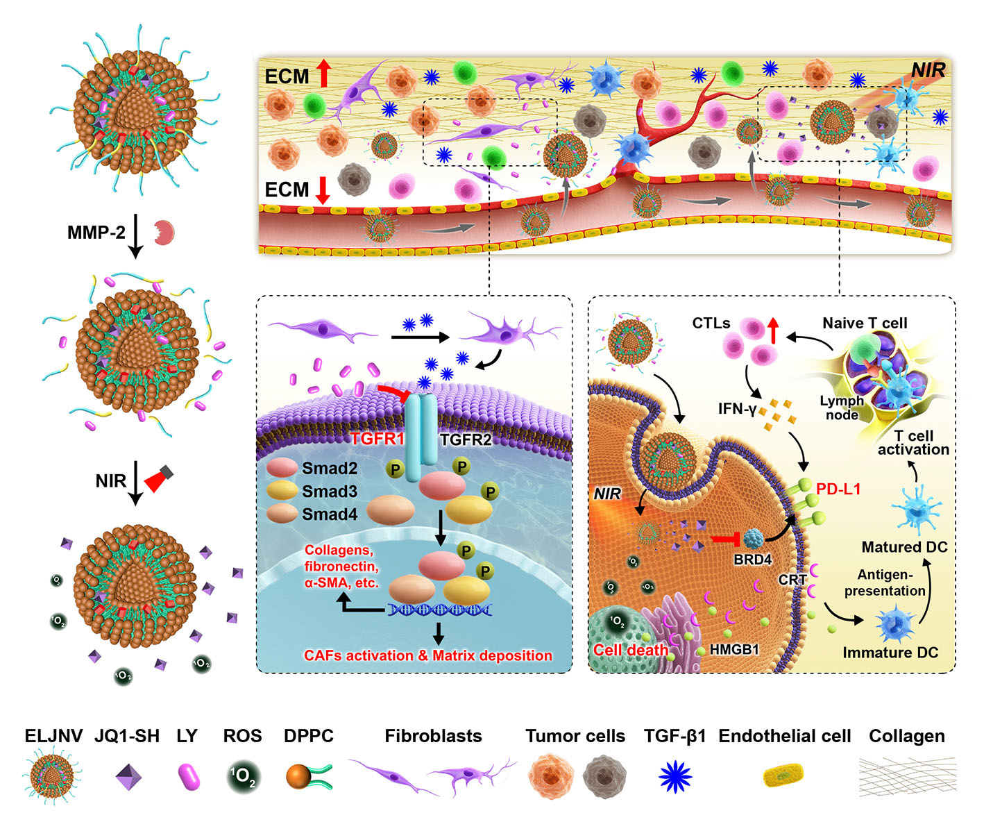 Furthermore, a tumor enzymatic microenvironment-activatable nanovesicle, namely ELNV, was constructed for the tumor-specific co-delivery of LY and a photosensitizer PPa. We found that the LY-loaded nanovesicles efficiently inactivated cancer-associated fibroblasts and suppressed tumor fibrosis by blocking the TGF-β signaling pathway, which promoted the intratumoral infiltration of T lymphocytes (Figure 1).