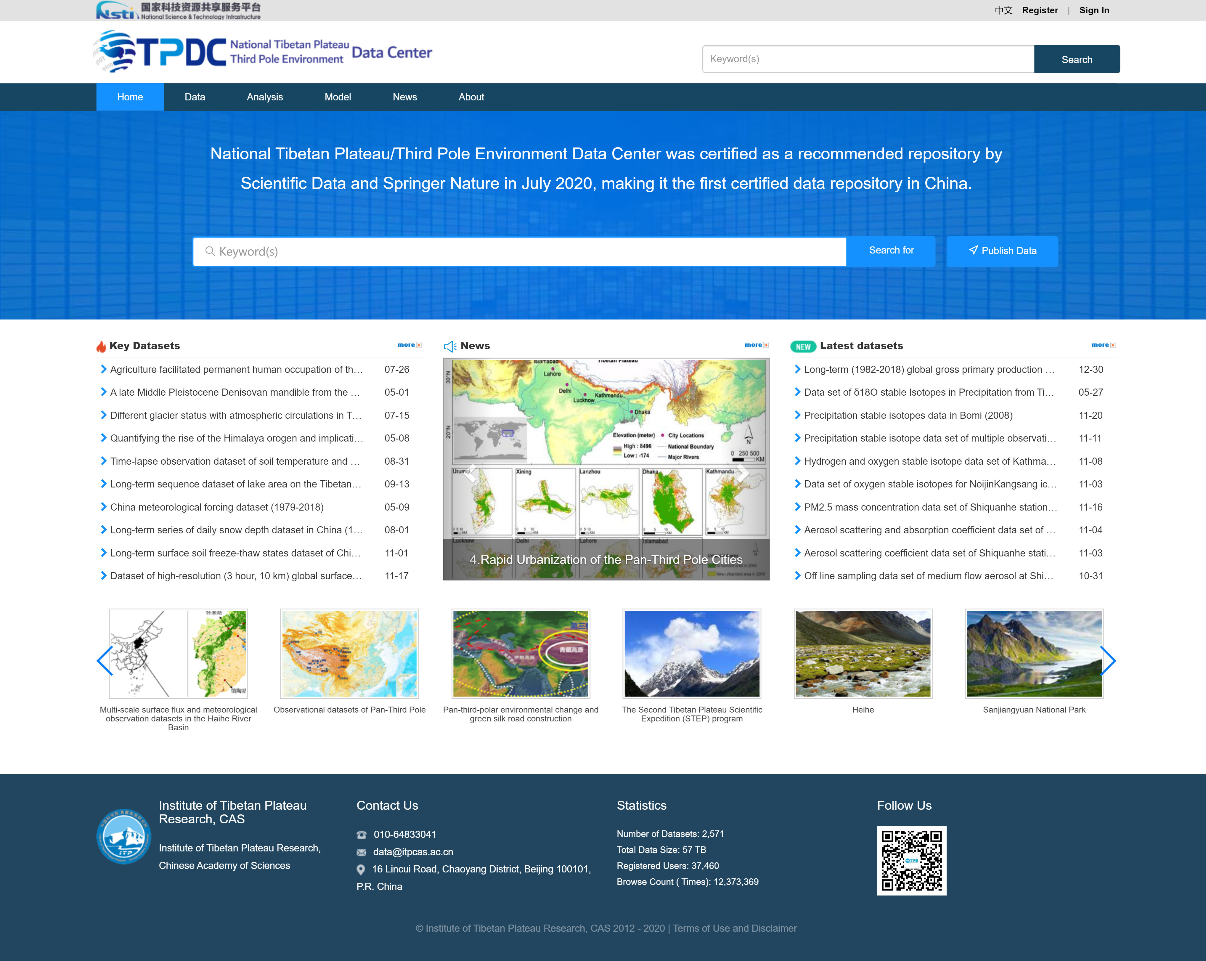 National Tibetan Plateau/Third Pole Environment Data Center (TPDC) was certified as a recommended repository by Scientific Data and Springer Nature in July 2020, making it the first certified data repository in China.