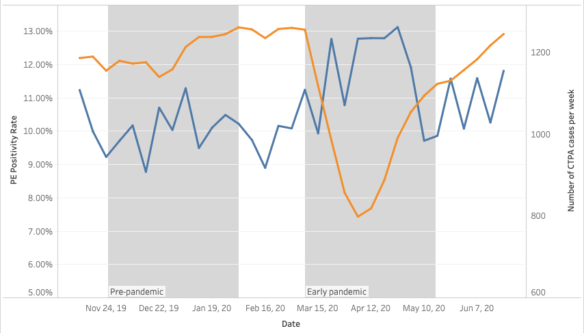 Establishing trends related to computed tomography pulmonary angiography (CTPA) during the COVID-19 pandemic could be meaningful, as blood clots turned out to be an important complication of the infection. CTPA is commonly used to evaluate the pulmonary arteries for the presence of pulmonary embolism (PE), which is a life-threatening condition caused by blood clots in the pulmonary arteries, impeding the uptake of oxygen into the blood stream in the lungs. It was not until June 2020 that a growing body of evidence indicated that the infection was a significant risk factor for developing PE1 and, subsequently, expert guidelines were published2. Due to changes in overall healthcare utilization, and evolving data on the association of thromboembolic events in the setting of COVID-19, it was not clear whether changes in the prevalence of PE were due to changes in testing frequency or a change in the incidence of the condition.