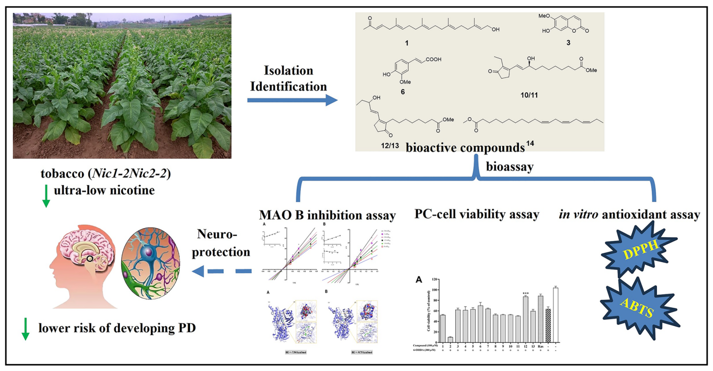 The chemical investigation of tobacco has revealed compounds with synergistic antioxidant, neuronal protective, and selective MAO-B inhibitory activities. These findings not only offer a molecular rationale for the observed epidemiological link between tobacco use and reduced Parkinson’s disease risk, but also identify a novel source for developing multi-target neuroprotective agents.