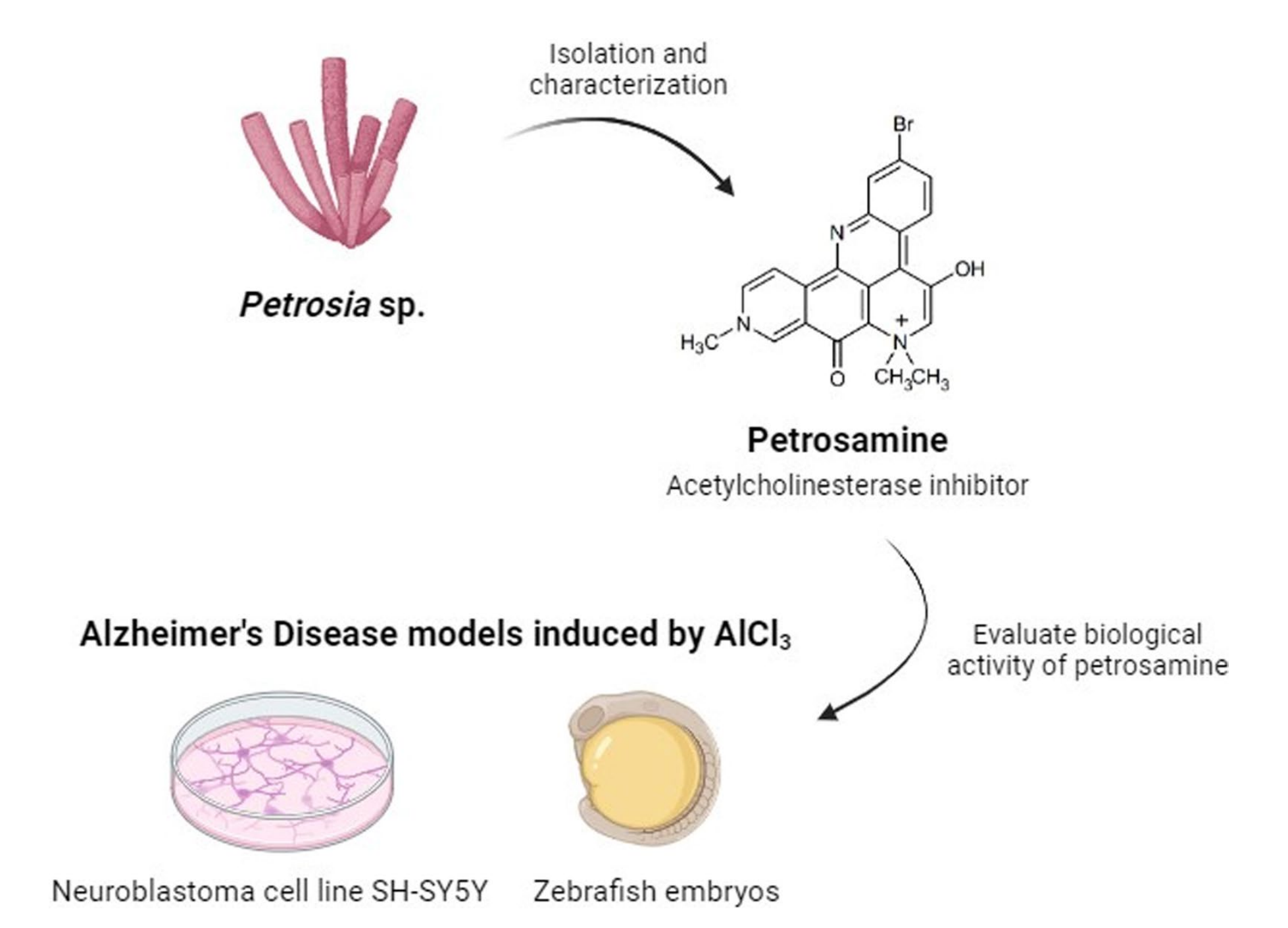 This study reports for the first time the neuroprotective activity of petrosamine, an alkaloid isolated from a marine sponge. In both aluminium chloride‑induced in vitro and zebrafish in vivo neurotoxicity models, petrosamine demonstrated consistent protective effects. This work preliminarily reveals its potential in counteracting neurotoxicity, offering a new candidate molecule for marine‑derived anti‑AD drug development.