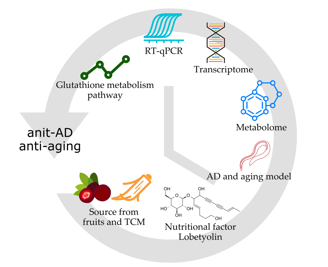 This study elucidates how lobetyolin, derived from a food-compatible medicinal source, counteracts Alzheimer’s disease. In C. elegans AD models, it reduced Aβ toxicity, extended lifespan, and lowered oxidative stress. Integrated omics analysis identified its core mechanism as reprogramming glutathione-centered redox metabolism. These findings position lobetyolin as a dietary factor with neuroprotective and anti-aging potential via metabolic regulation.