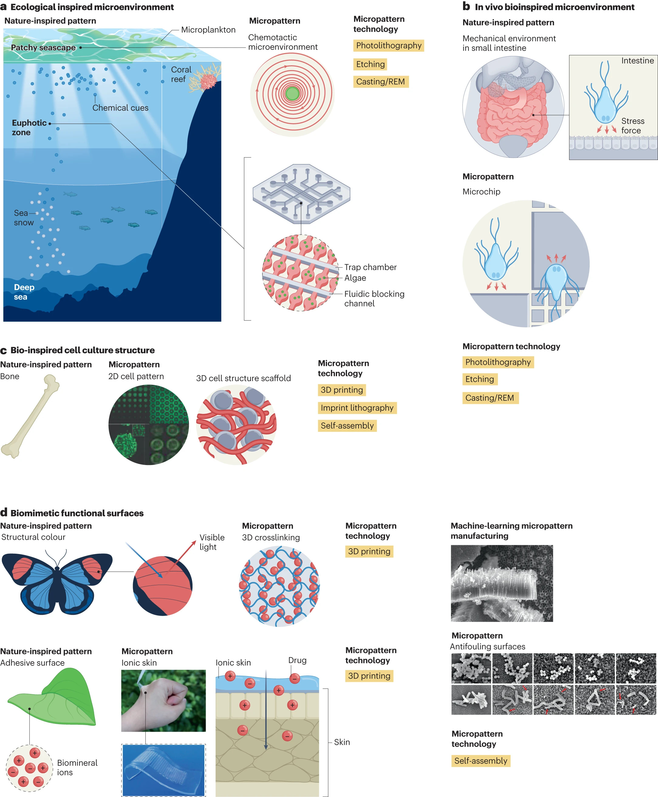 Form factors depend on the intended application. a, Ecological inspired microenvironment, focusing on an ecological microplankton microhabitat in a marine euphotic zone that receives enough light for photosynthesis to occur and induce chemotaxis to supply the food web. b, In vivo bioinspired microenvironment, showing in vivo-like physical microenvironment of the stress force field in the small intestine. c, Nature-inspired micropattern applications mimicking bioinspired cell culture structures, focusing on reconstituting 2D and 3D cell culture scaffolds. The 2D cell patterns show the generation of a heterogeneous microtissue array. The 3D cell culture shows a scaffold-based strategy for bone graft substitutes. d, Nature-inspired micropattern applications mimicking biofunctional surfaces, including adhesive surfaces, antifouling surfaces and structural colour facilitated by 3D-crosslinking. REM, replica moulding. Part b adapted with permission from ref. 42. Copyright 2020 American Chemical Society. Part cadapted with permission from ref. 36. Part d (adhesive surfaces) adapted with permission from ref. 20, Wiley. Part d (antifouling surfaces) adapted with permission from ref. 120.