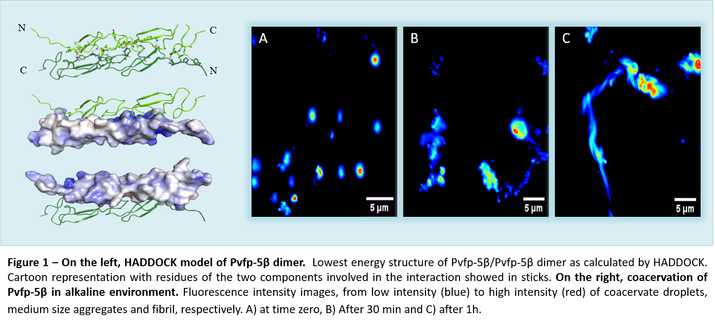To this purpose, we structurally characterized the recently identified byssal plaque adhesive protein from the Perna viridis mussel species, Pvfp-5β10,11; the first to be secreted by mussels and to initiate an interaction with sea surface. The recombinant Pvfp-5β was produced to jump the difficulty in recovering Pvfps proteins from their native source, and, more important, to deal with a no Dopa form of Pvfp-5β and explore adhesive features other than DOPA. Using a biophysical approach, based mainly on Nuclear Magnetic Resonance (NMR) and supported also by an extensive probing of its cell adhesion properties, we demonstrated that it is possible to produce recombinant Pvfp-5β in bacteria and perform a complete structural characterization of Pvfp-5β. We demonstrated it is able to coacervate and evolve in fibrils in a process similar to the formation of the amyloid fiber (Fig.1).