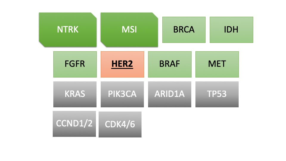 One important advancement for patients with cholangiocarcinoma in the last few years has been the identification of potentially actionable genetic aberrations or findings. By actionable we mean that either they already have a new drug besides chemotherapy that could be used for these patients or that there are active ongoing open clinical trials for these patients that already are showing promise. Experts would often use the term "target-rich" since if we just glance at figure below, the odds of finding an actionable finding is pretty high.