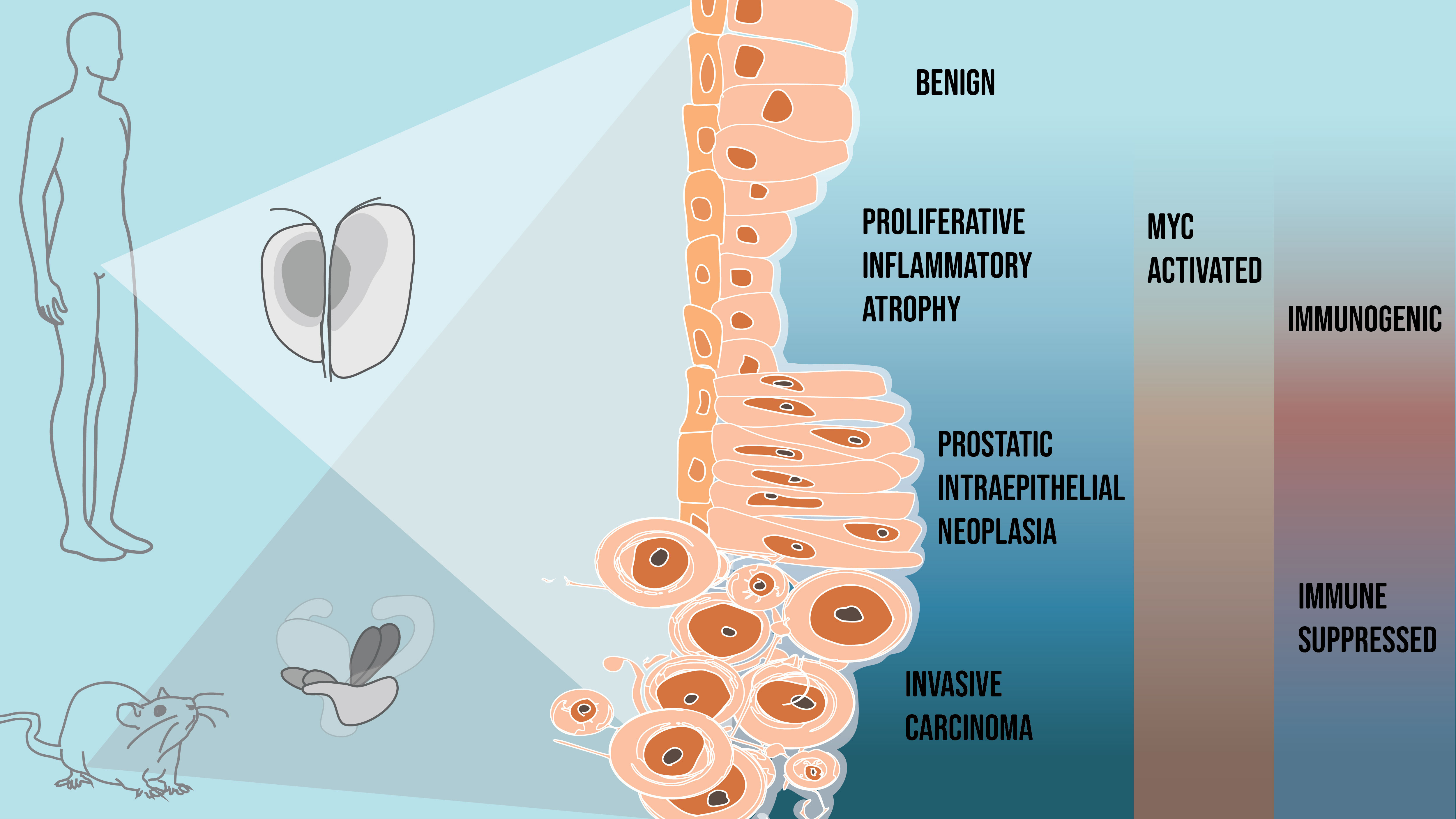 - What struck us as we performed our studies was that these changes in the prostate tissue were dynamic. Prostate cancer is notorious for being “immunologically cold”, and we would expect to see tissue changes consistent with something immunosuppressive. However, MYC activation initiated a pro-inflammatory state, paralleling what we see in human proliferative inflammatory atrophy (PIA). PIA was first described and reported by co-authors Angelo De Marzo and Bill Nelson and has been proposed to be a hotbed from which neoplastic prostate epithelial cells can arise.
