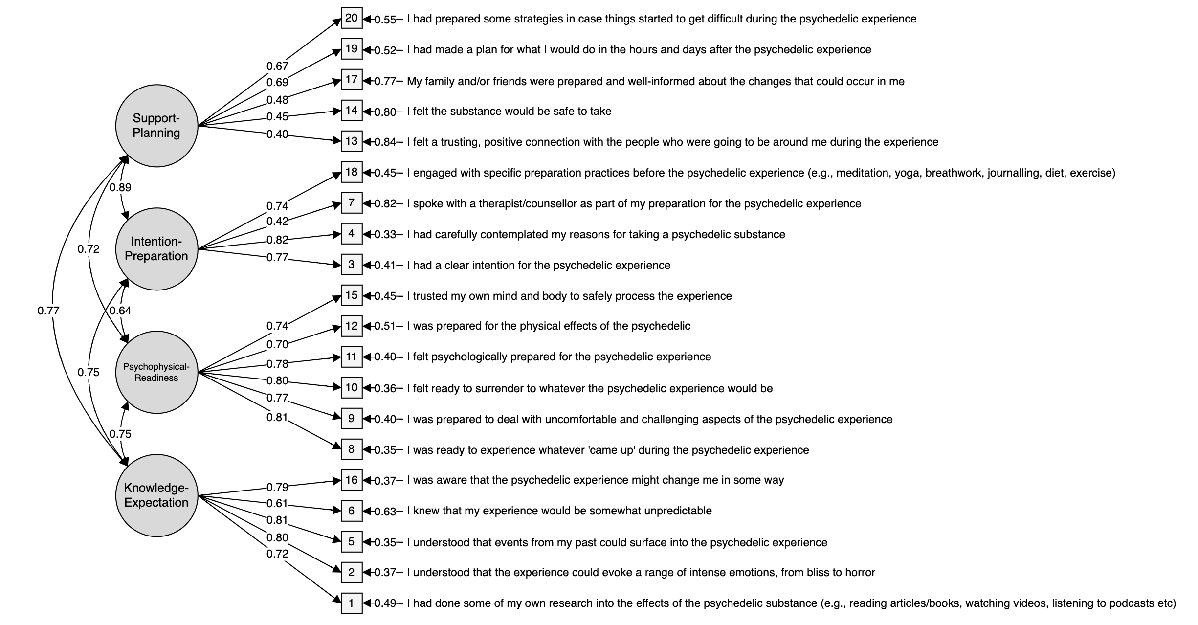Our research into psychedelic preparedness culminated in the identification of four distinct factors, each encapsulating a fundamental aspect of 'readiness' for psychedelic experiences. These factors are not only pivotal in their standalone significance but also interact dynamically, influencing the overall quality and therapeutic outcomes of psychedelic sessions.
