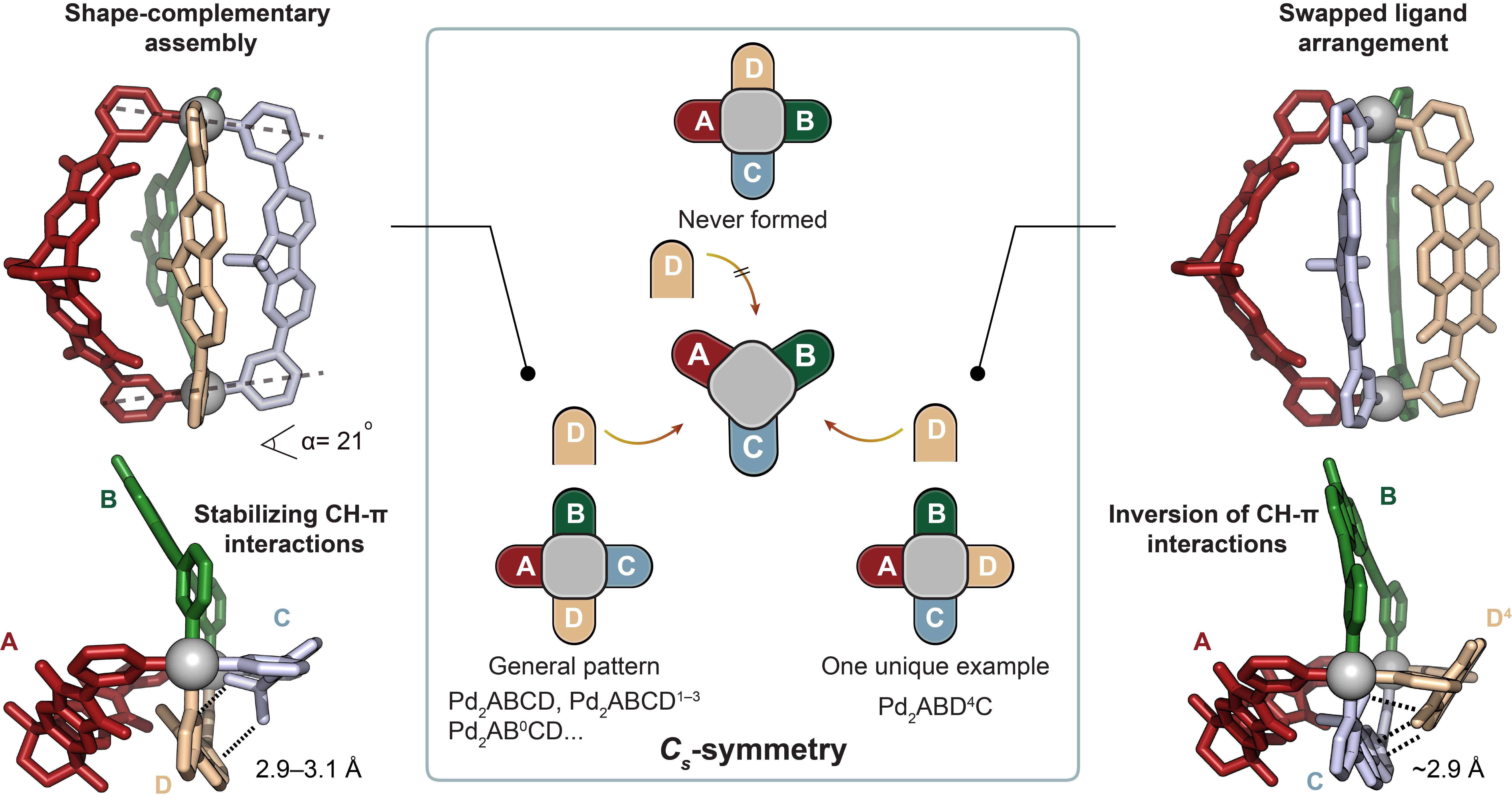 Figure 2. Possible cage isomers and comparison of crystal structures of [Pd2ABCD] and [Pd2ABD4C]. Left: side and top X-ray views of cage [Pd2ABCD]4+ (dihedral angle α between [Pd(Py)4] planes shown to indicate the presence of pronounced shape-complementarity and distances of C-H⋯π interactions between C and D assigned). All the ligand combinations with D, and D1–D3 led to the general ABCD pattern. Middle: Three configurational isomers with Cs-symmetry arranging four different ligands circularly around two metal nodes shown. Right: side and top X-ray views of [Pd2ABD4C] showing a swapped ligand arrangementand inversion of C-H⋯π interactions (C-H⋯π distance between ligands D4 and C given).