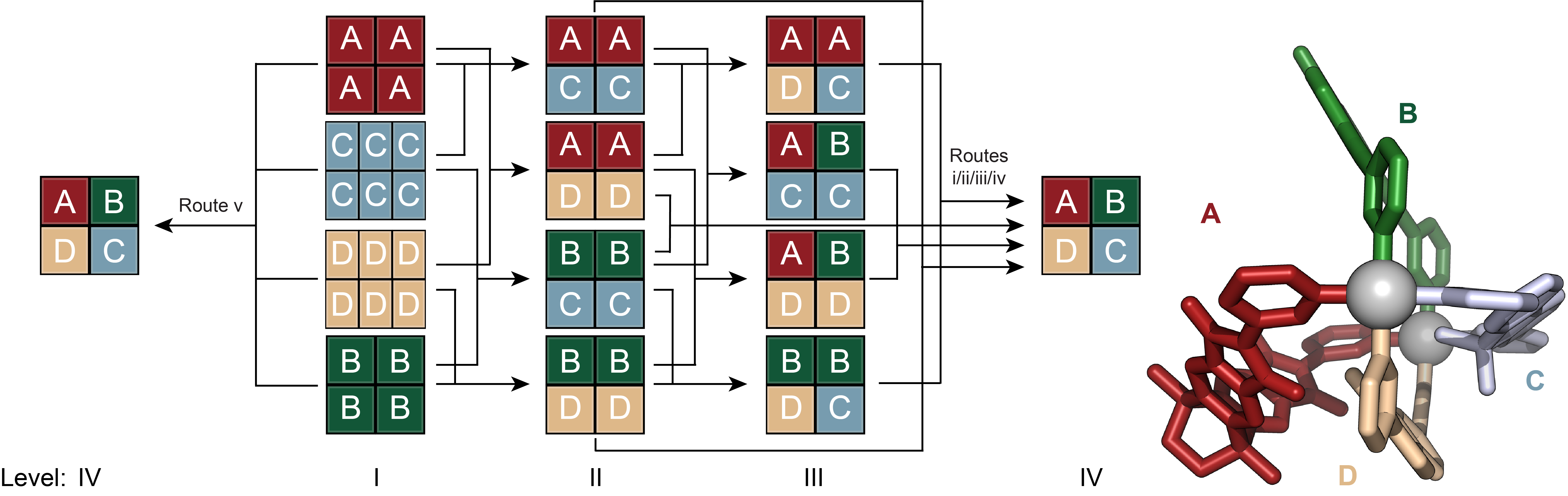 Figure 3. Self-assembly of heteroleptic multicomponent cage [Pd2ABCD]4+ from four chemically different ligands. Evolution of complexity from homoleptic assemblies to the most complex heteroleptic assembly [Pd2ABCD]4+ via different pathways.