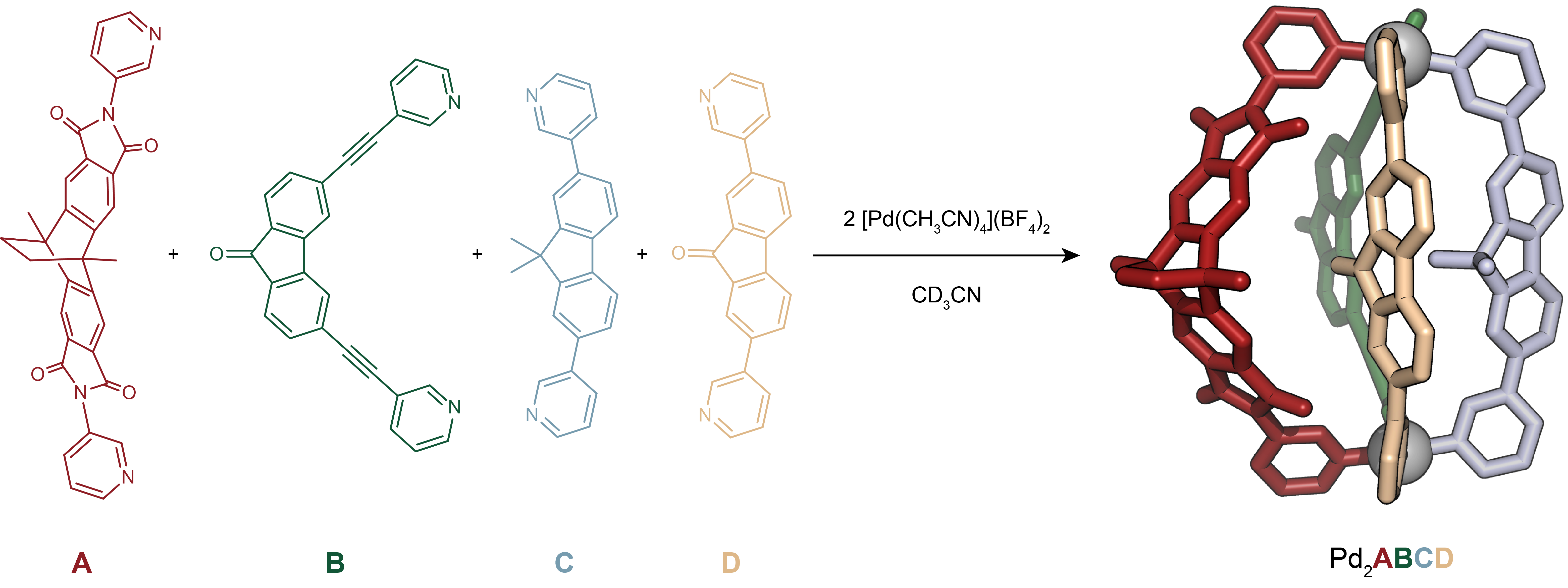 The self-assembly of supramolecular coordination cages, mimicking biological systems such as receptors and enzymes, has captivated the attention of synthetic chemists. In a recent Nature Chemistry paper, our team delves into the progressive assembly of multicomponent [Pd2ABCD] cages, composed of two palladium ions and four different organic bridges, inspired by the sophisticated and low-symmetry nano-confinements found in folded biopolymers. This work stands at the crossroads of coordination chemistry and supramolecular self-assembly, pushing the boundaries of what can be achieved in creating precisely shaped, non-statistically assembled multicomponent structures.