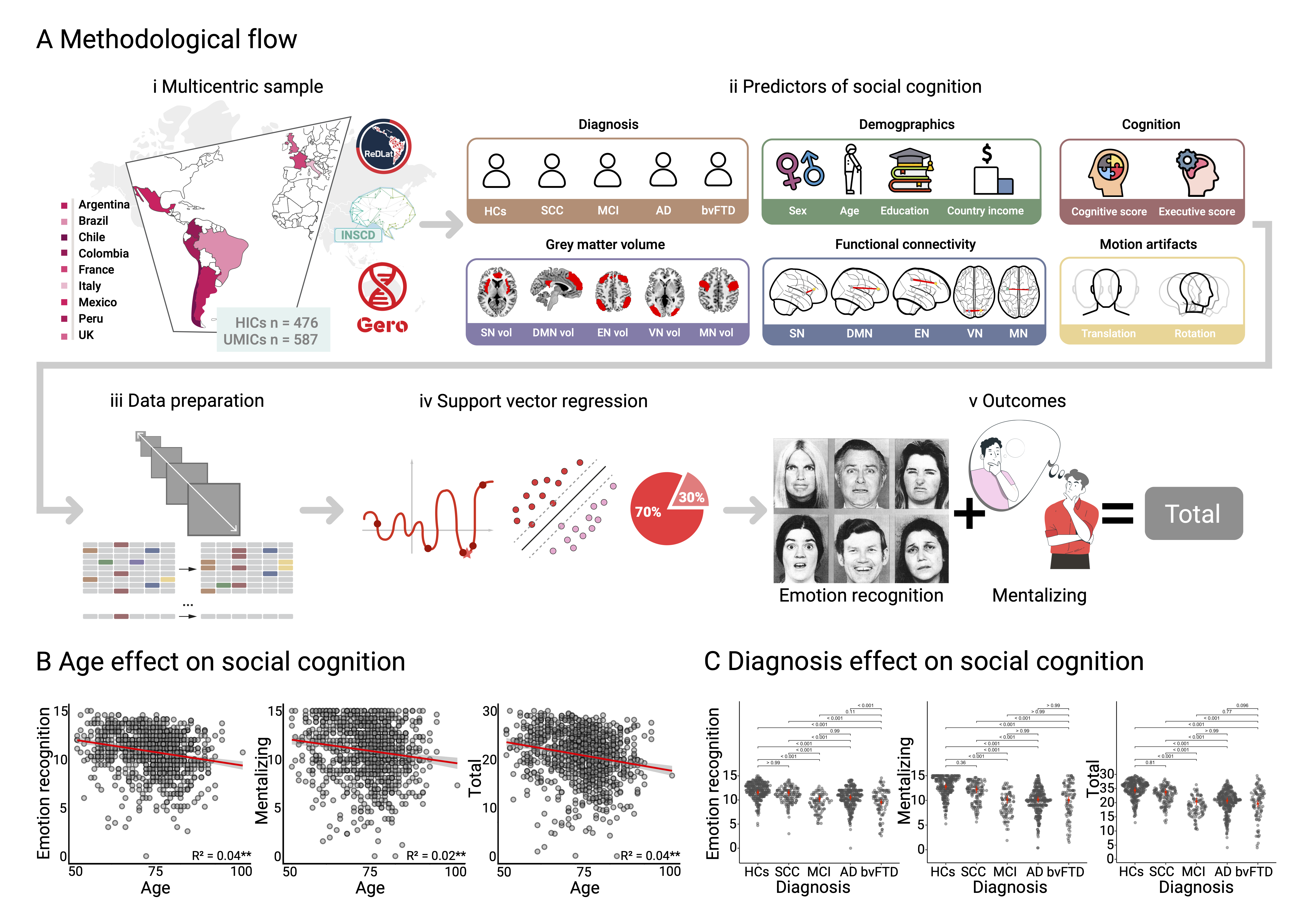 Figure 1. Study design and traditional effects of age and diagnosis on social cognition. (A) i. Participants were recruited from high-income and upper-middle-income countries through the ReDLat dementia consortium, the International Network on Social Condition Disorders, and the Geroscience Center for Brain Health and Metabolism. ii. Diagnosis, demographics, cognition, grey matter volume fMRI resting-state functional connectivity of brain networks, and in-scanner motion artifacts were entered into computational models as predictors of social cognition. iii. Data were harmonized across countries. iv. Data were analyzed using support vector regression models with Bayesian optimization for hyperparameter tuning in 70-30 train and test partition and using a bootstrap approach. v. Outcome variables were facial emotion recognition, mentalizing, and a social cognition total score from the Mini-Social Cognition and Emotional Assessment (Mini-SEA) battery. (B) Age significantly predicted worse performance in emotion recognition, mentalizing, and the total score. (C) Participants with mild cognitive impairment (MCI), Alzheimer’s disease (AD), and behavioral variant frontotemporal dementia (bvFTD) performed significantly worse in social cognition relative to the groups of healthy controls (HCs) and subjective cognitive complaints (SCC).