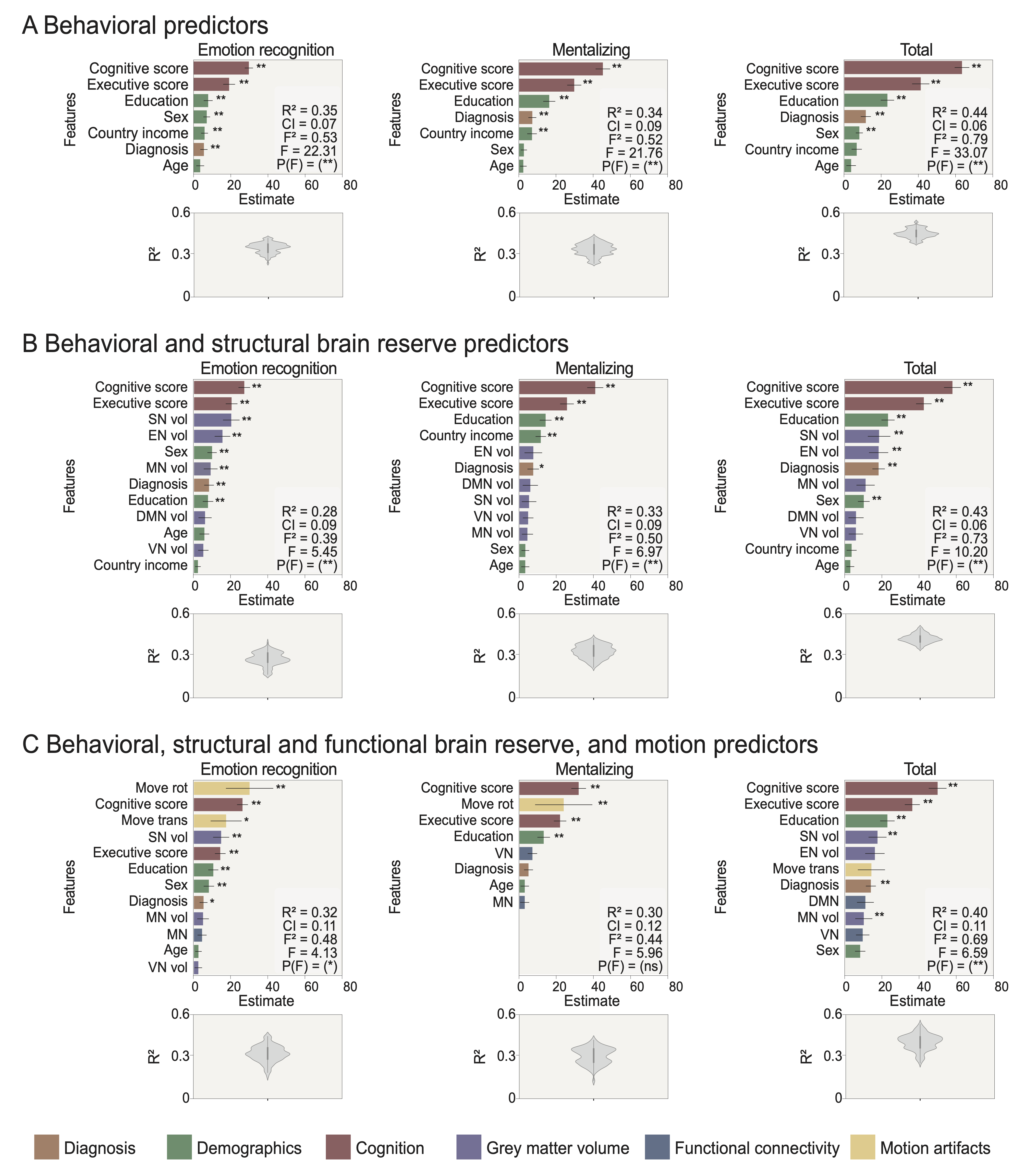 Figure 2. Support vector regression results. (A) Models including diagnosis, demographics, and cognition as predictors of social cognition performance. (B) Models include one level of brain reserve (grey matter volume) and behavioral features as predictors of social cognition performance. (C) Models include resting-state functional connectivity features (brain networks and motion artifacts) as predictors of social cognition performance and behavioral and grey matter volume predictors. DMN: default mode network, EN: executive network, MN: motor network, SN: salience network, VN: visual network, vol: volume.