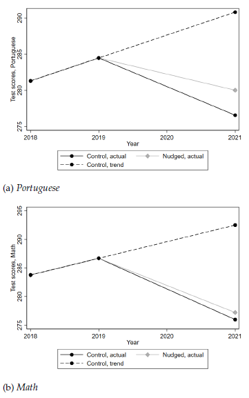 Based on the State's standardized tests over the years in the State, high-school senior students’ average proficiency backtracked 2.84 years in math and 2.25 years in Portuguese in the absence of in-person classes. We find that the intervention significantly increased standardized test scores relative to the control group, preventing 7.5% of learning losses in math and 24% in Portuguese.