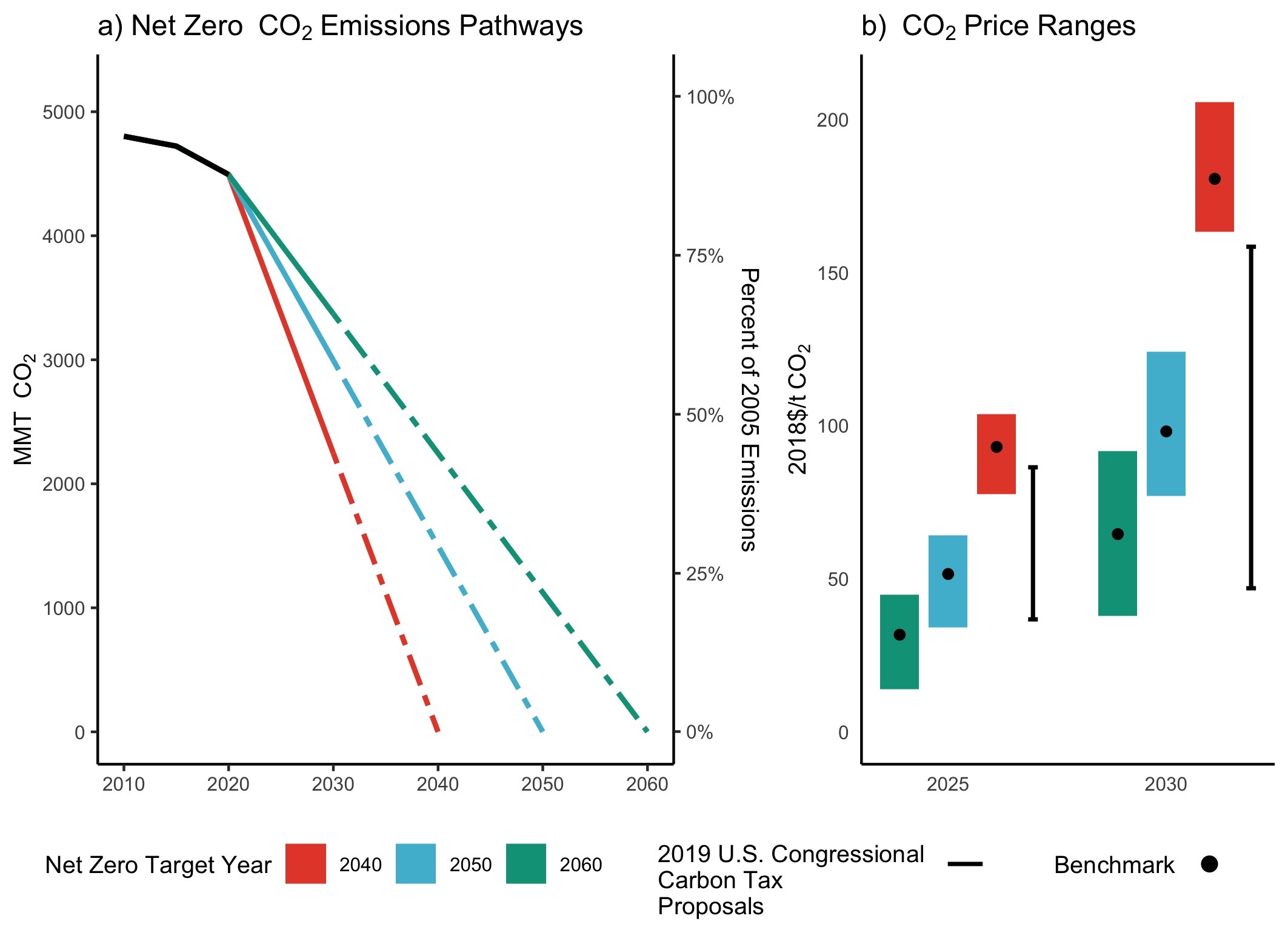 Fig. 1 | US CO2 emissions pathways to net zero and associated NT2NZ CO2 prices. a) Historical emissions (black) and CO2 emissions pathways consistent with a straight-line path to net-zero CO2 in the target year. b) Illustrative ranges of CO2 prices in 2025 and 2030 needed to reduce US net CO2 emissions on each of the three emissions pathways (NT2NZ CO2 prices; bars). The black dots reflect benchmark scenario NT2NZ CO2 prices. The whiskers represent the ranges of CO2 prices in proposals to the US Congress in 2019.
