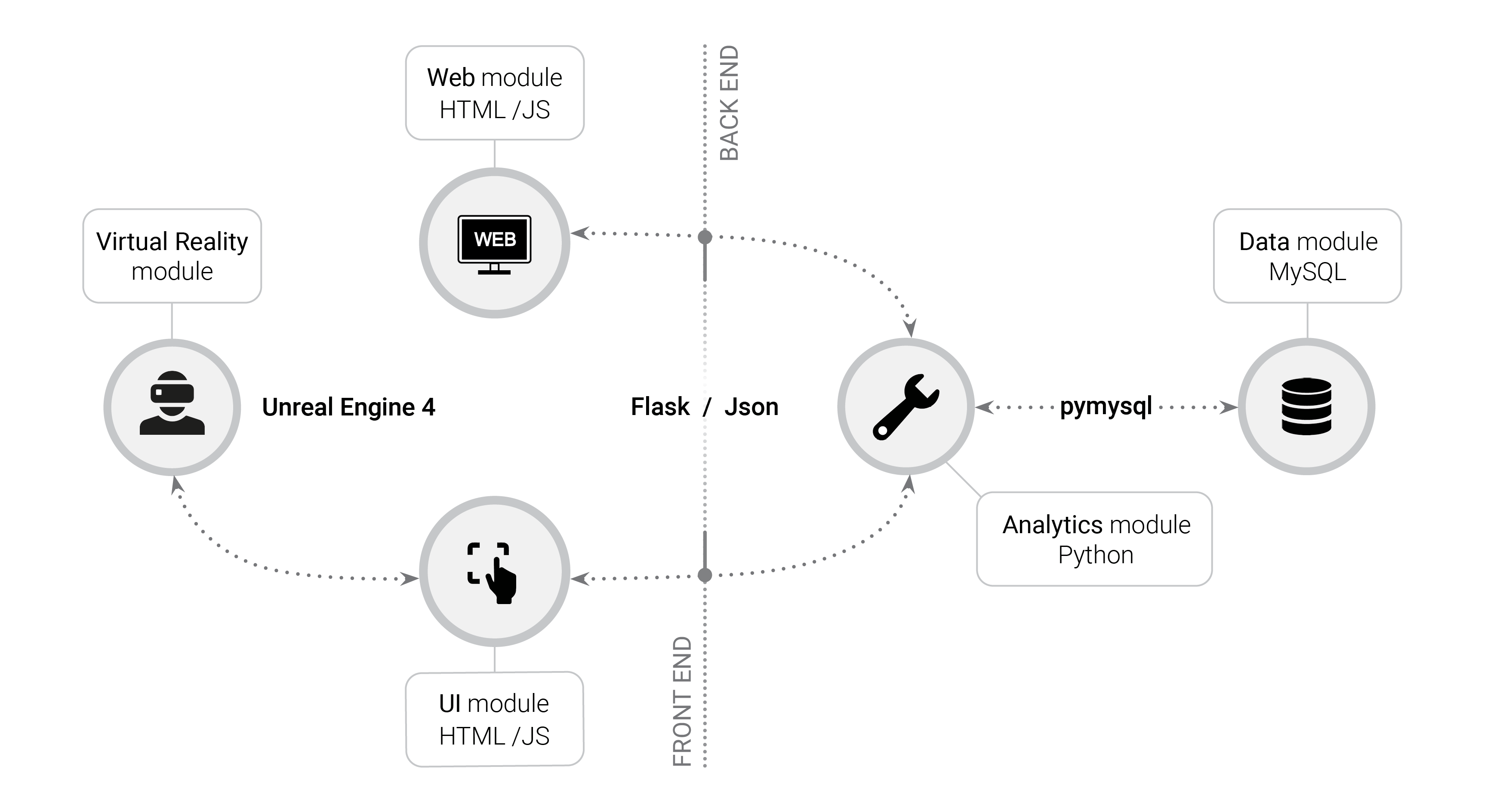 Twenty years ago, this was unimaginable -- but with the advancements in gaming technology and computing power, huge networks become (virtual) reality. Our platform is built in an open and modular fashion: the core of our platform, the VR module, is implemented on Unreal engine 4, the industry gold standard in the video game world. It boasts astounding graphics performance, maximal compatibility with a variety of VR headsets, and it’s open source, too! The analytics module is written in Python and served with Flask. It contains all the code for network visualization and analysis, as well as helper functionality to upload new networks into the tool and download them to a format compatible with other network analysis tools. The two modules are linked together with a user interface module coded in Python/Flask, Javascript and html. All of these modules are open source and can be further customized by the user.