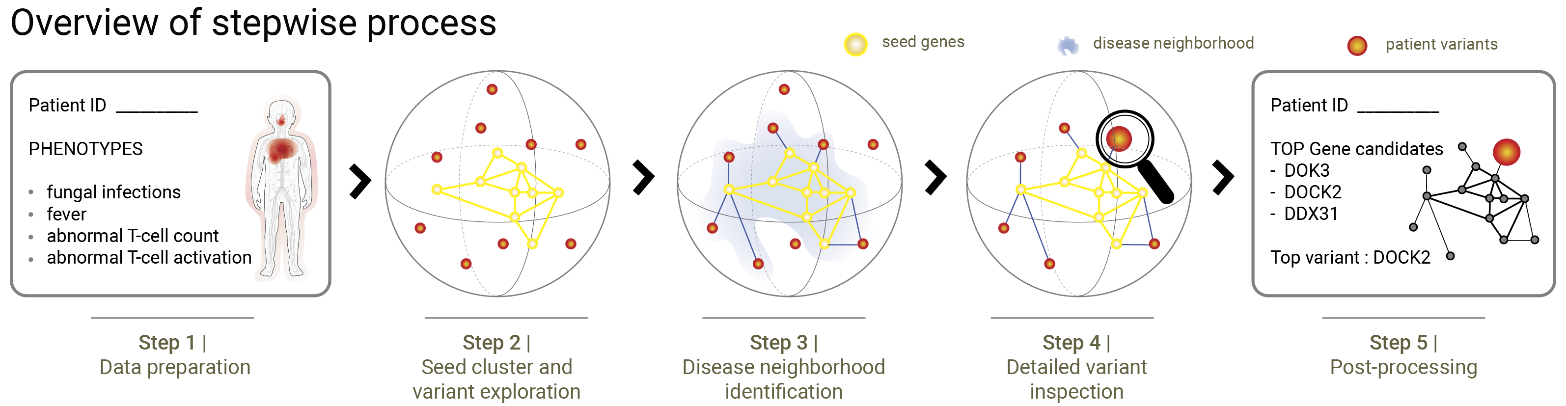 In one case, we had a patient suffering from severe combined immune deficiency (SCID) with an unknown genetic cause. The patient presented with recurrent severe infections, fever, and thrush. An immune panel revealed a low T-cell count and defective T-cell activation. Next generation sequencing of the patient’s DNA revealed several hundred variants; by applying filters for frequency and quality, confirmation by Sanger sequencing, and comparisons with the patient’s pedigree (segregation analysis), we are left with 15 candidate genes. By examining the local and global network neighborhoods of these genes in several functional contexts, we can collect the pieces of the puzzle to find the cause of the patient's symptoms.