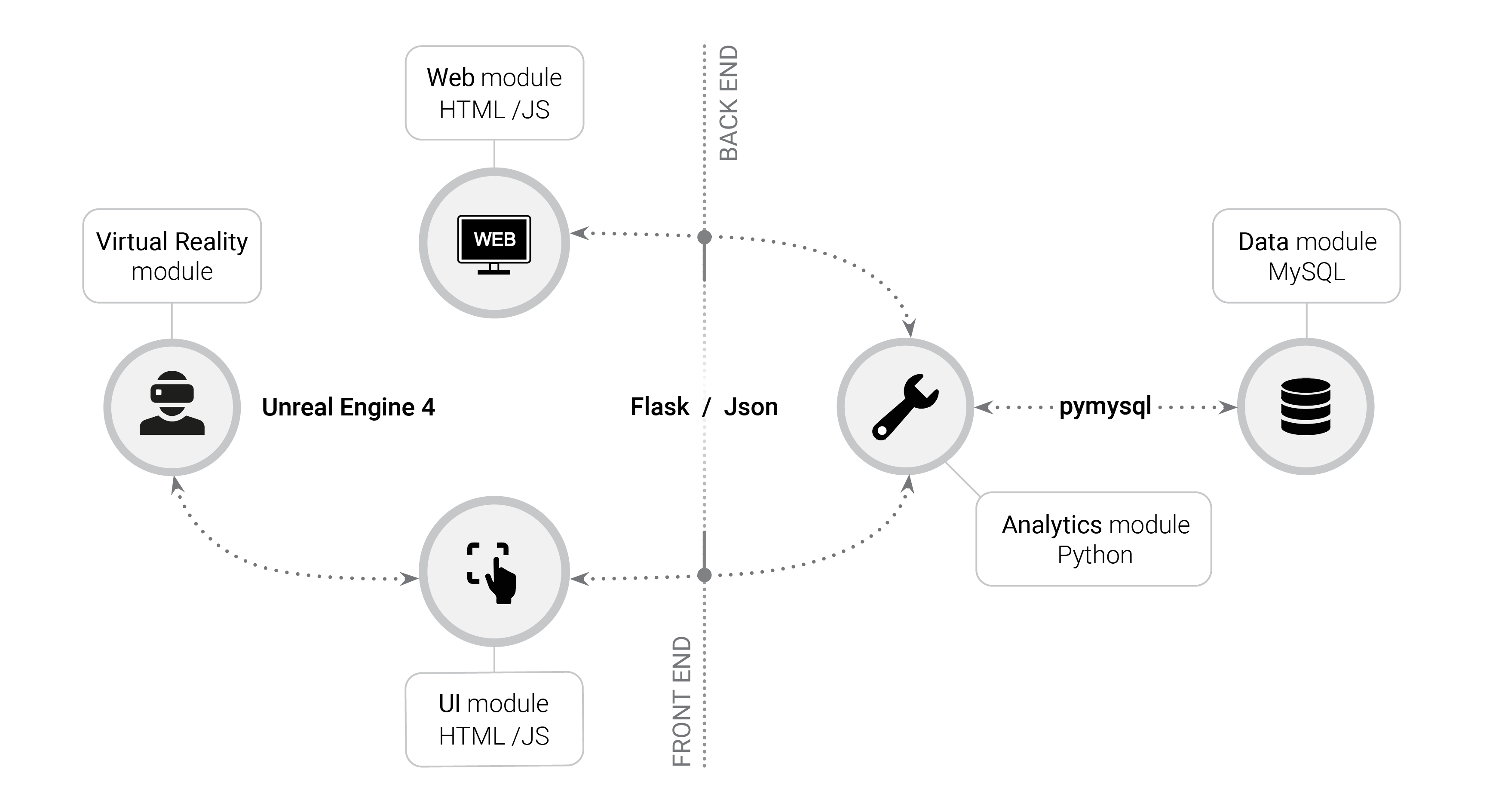 Twenty years ago, this was unimaginable -- but with the advancements in gaming technology and computing power, huge networks become (virtual) reality. Our platform is built in an open and modular fashion: the core of our platform, the VR module, is implemented on Unreal engine 4, the industry gold standard in the video game world. It boasts astounding graphics performance, maximal compatibility with a variety of VR headsets, and it’s open source, too! The analytics module is written in Python and served with Flask. It contains all the code for network visualization and analysis, as well as helper functionality to upload new networks into the tool and download them to a format compatible with other network analysis tools. The two modules are linked together with a user interface module coded in Python/Flask, Javascript and html. All of these modules are open source and can be further customized by the user.