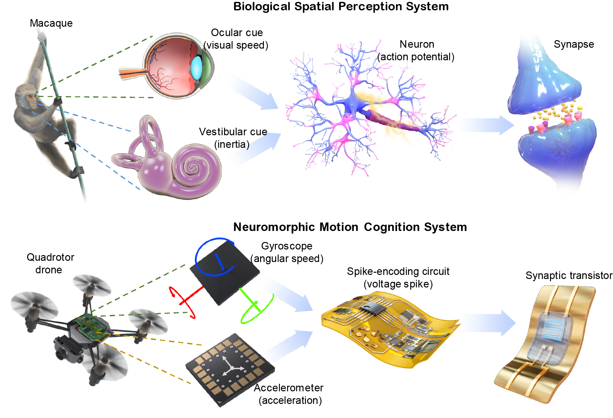 In our recent work published in Nature Communications, a motion-cognition neuromorphic nerve was developed to achieve a brain-like multisensory integration. For the macaque monkey, self-motion in the environment invokes inertial stimuli in the inner-ear vestibular, and visual stimuli in the retina (Figure 1). The vestibular-inertia and visual-speed information are converted to spike trains carrying different spatiotemporal patterns and then processed in the neural and synaptic networks through the process of sensory perception. Such integration of information from two different sensory modalities results in neural and behavioral response enhancement regarding motion and spatial perception. Similar to the ocular-vestibular system of the macaque, acceleration and angular speed signals are obtained by an accelerometer and a gyroscope in our system (Figure 1). The motion signals are firstly converted into two temporally correlated spikes and then processed by a multi-input synaptic device. The temporal pattern of the two spikes affect the output of the synaptic device. Recognition of motion information is implemented by averaging the spike firing rate and reading the device output in an event-based manner. As a result, neuromorphic perception of motion information through multisensory cue integration is achieved.