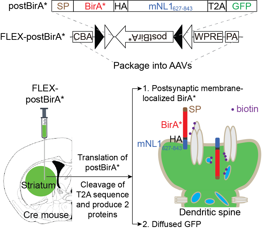 (I) Cell-type-specific proximity biotin-labeling (Figure 2): We expressed a biotin ligase, BirA*, in the iSPN (in Adora2-Cre mice) and dSPN (in Drd1-Cre mice) postsynaptic membranes. This method enables us to selectively chemically tag the postsynaptic proteome of iSPN and dSPN respectively.