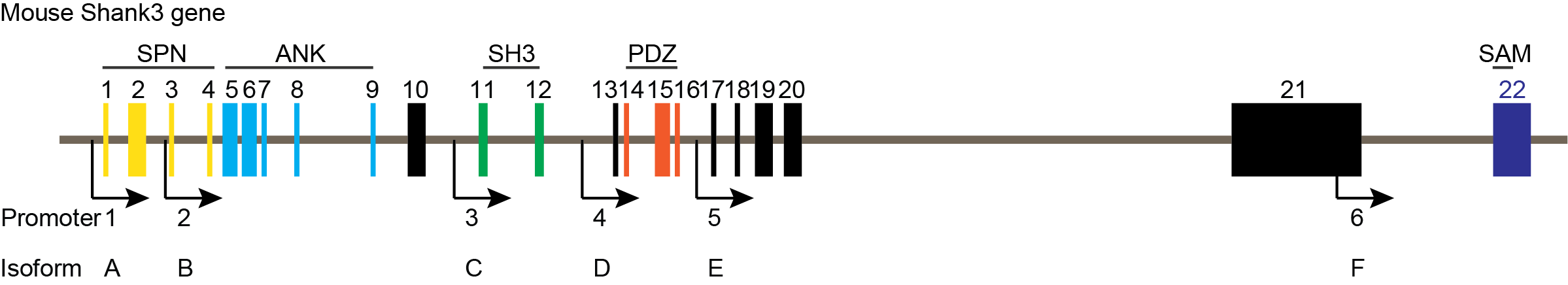 Figure 1. Mouse Shank3 gene (Gene ID: 58234) has 22 exons and six known promotors.