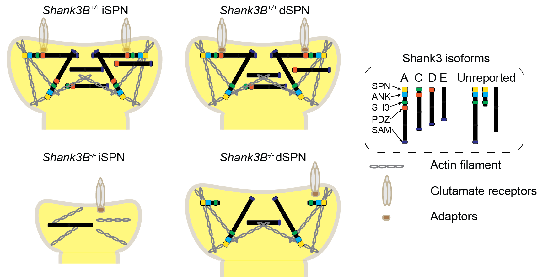 (I) The expression of Shank3 protein isoforms varies between iSPNs and dSPNs. In Shank3B-/- iSPNs, there is an almost complete loss of Shank3 proteins. Whereas in Shank3B-/- dSPNs, several Shank3 protein isoforms, such as Shank3E, are still expressed (Figure 3).