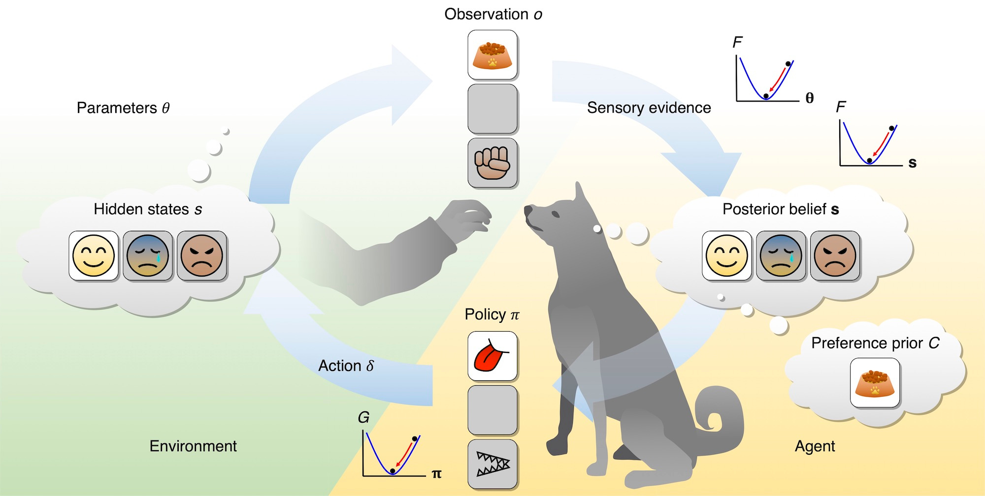 Fig. 1. Schematic of the free-energy principle. Here, the external world (the person) generates sensory inputs (observation) from hidden states according to a generative model. The agent (the dog) performs active inference by updating posterior beliefs about hidden states, parameters, and actions to minimise variational free energy F. Policy is also updated by minimising expected free energy G. Figure is reproduced from a Review paper5. (CC BY 4.0)