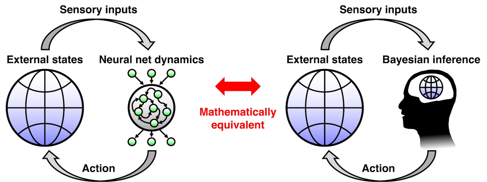 Fig. 3. Equivalence between neural network dynamics and Bayesian inference. The left figure shows a neural network, which receives sensory inputs from the external world, generates internal dynamics, and feeds back responses to the external world in the form of action. This process can be formulated as Bayesian inference as shown in the right figure. (CC BY 4.0)