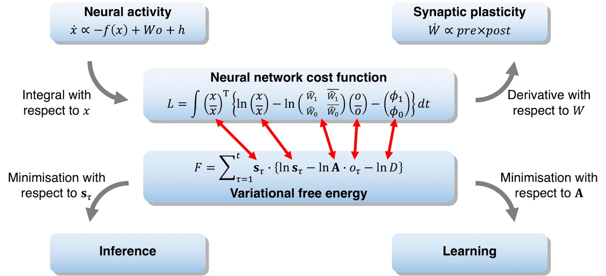 Fig. 2. Schematic of the reverse engineering. Here, x is a vector of neural activity (firing rate), o is a vector of sensory input, W is a matrix of synaptic weights, h is the firing threshold, and L is the cost function of the neural network (where the x bar indicates one minus x, the W hat is the sigmoid function of W, and φ1, φ0 are constants). Moreover, F is variational free energy, sτ is the posterior expectation about hidden states, A is the posterior expectation about parameters, and D is the prior belief about hidden states. (CC BY 4.0)