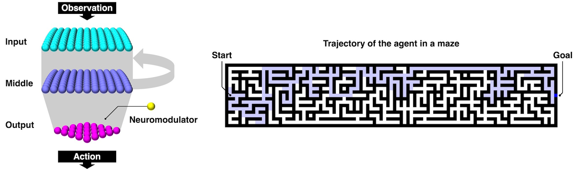Fig. 4. Agent solving a maze task and its neural network. An agent with the neural network shown in the left figure can solve a maze task, as shown in the right figure. Here, the agent observes the states of the neighbouring 11×11 cells and selects up, down, left, or right motion. The agent’s neural network exhibiting delayed modulation of Hebbian plasticity learns how to reach the goal (right edge) in a self-organising manner. (CC BY 4.0)
