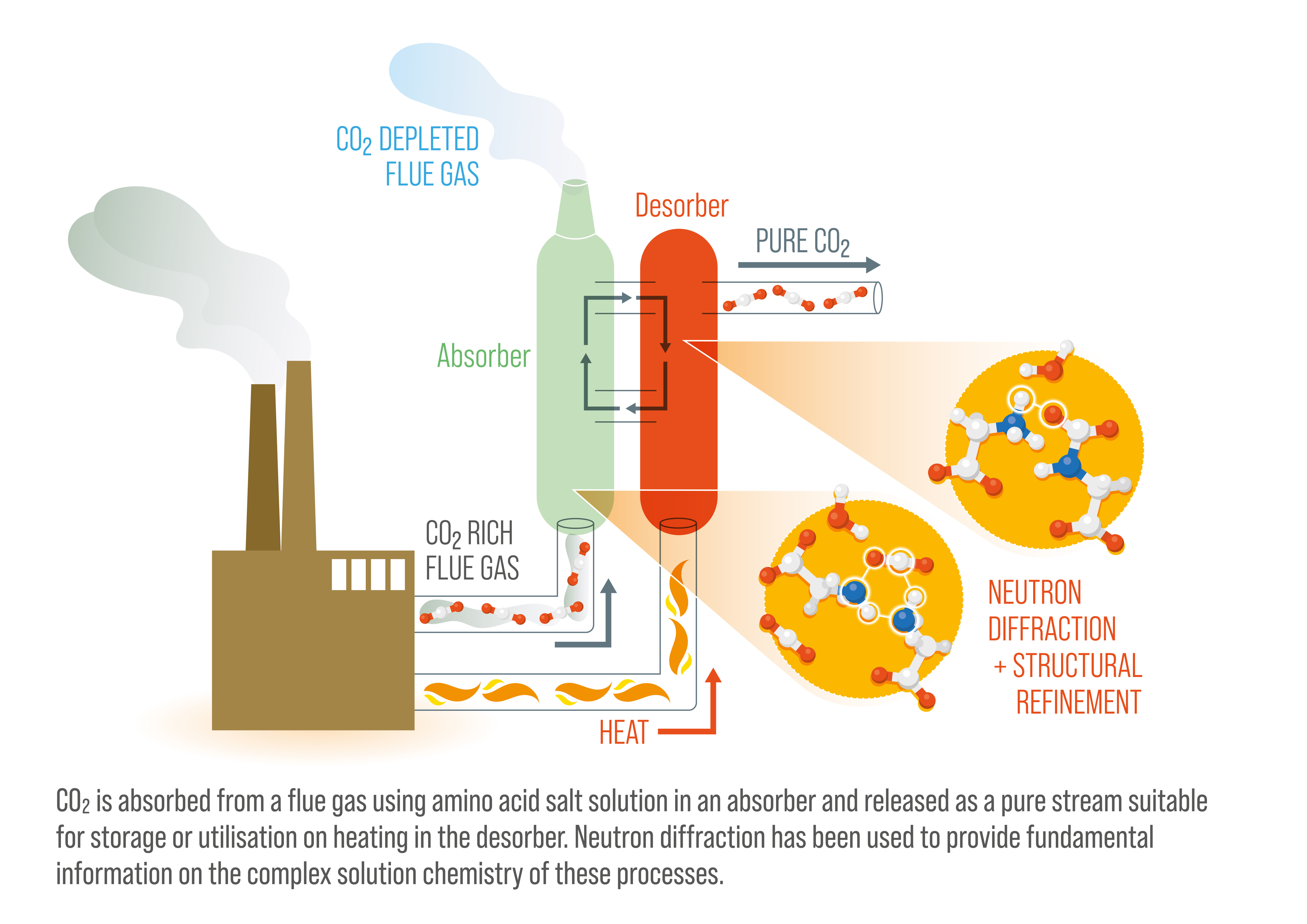 Using the combined neutron diffraction and computational modelling approach gave us atomic level insight into these complex systems, allowing us to probe the occurrence of interactions between molecules required for the various chemical routes which enable CO2 loading and offloading. Briefly, a single hydrogen atom must be lost at the absorbing site on an amino acid molecule, such that it can be replaced by a CO2 molecule. The hydrogen atom must then navigate its way through the solution to find a second amino acid molecule, which will accept the hydrogen. The total process of CO2 capture in these solutions therefore requires two amino acid molecules to absorb a molecule of CO2. The reaction occurs in the reverse direction for the liberation of CO2 to enable the solvent to then be reused in further capture cycles.