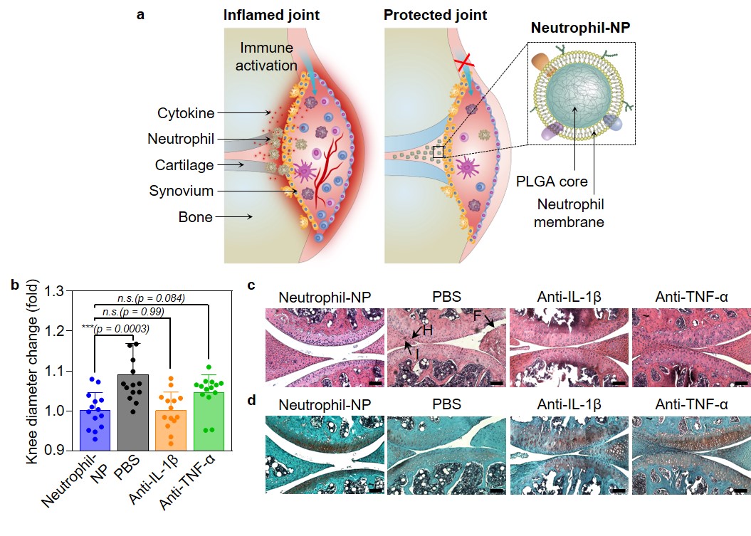 Figure 2. a, Schematic representation of neutrophil-NPs designed for suppressing synovial inflammation and ameliorating joint destruction in inflammatory arthritis. b, Change of hind knee diameter on day 60 compared to that of day 0 in a therapeutic study with CIA mouse model. c,d, Representative images of H&E staining (c) and safranin-O staining (d) on knee sections from mice treated with neutrophil-NP, PBS, anti-IL-1β antibody or anti-TNF-α antibody. Scale bars, 100 μm. F, synovial membrane fibrillation; H, synovium hyperplasia; I, immune cell infiltration. Figure adapted from our paper13. SpringerNature.