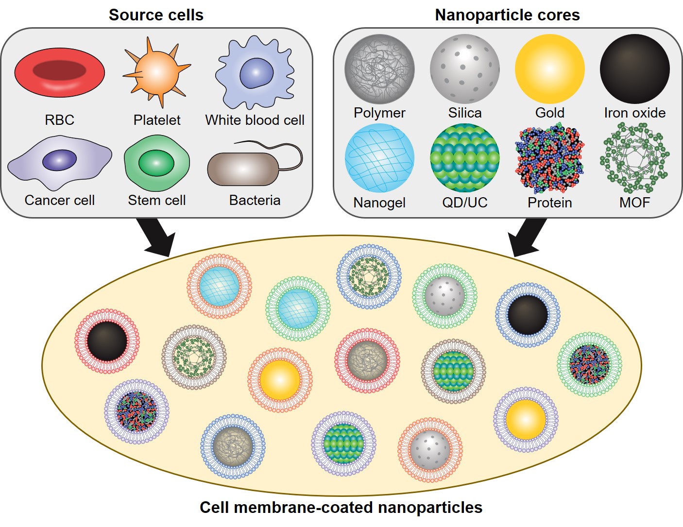 Figure 1. Design concept of cell membrane-coated nanoparticles. A variety of cell types have been used as sources of membranes to coat over nanoparticles. Each cell membrane type can utilize unique properties to provide functionalities to nanoparticulate cores, the material of which can be varied depending on the desired application. Figure adapted from reference 4.
