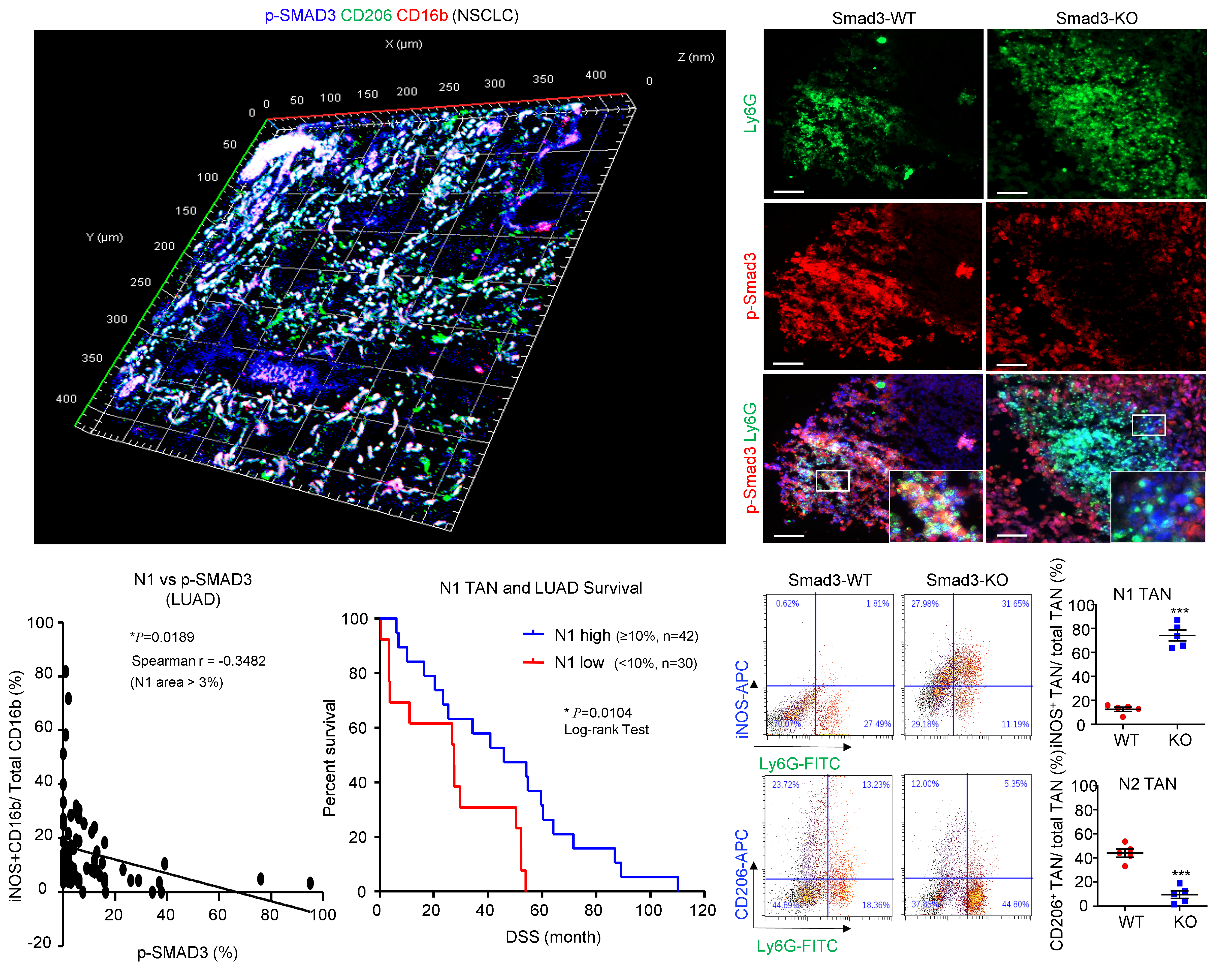 Neutrophils are originated from bone marrow, where we previously reported a TGF-β/Smad3 signalling dependent TME for suppressing anti-tumor immunity against lung cancer cells9. Therefore, we examined the possibility of Smad3 in TAN regulation. Interestingly, we detected a negative correlation between Smad3 activation and N1 suppression in the NSCLC patients as well as in the experimental mouse model Lewis lung carcinoma LLC (Figure 2), uncovering an importance of Smad3 signalling in the N1/N2 polarisation of TANs in lung cancer.