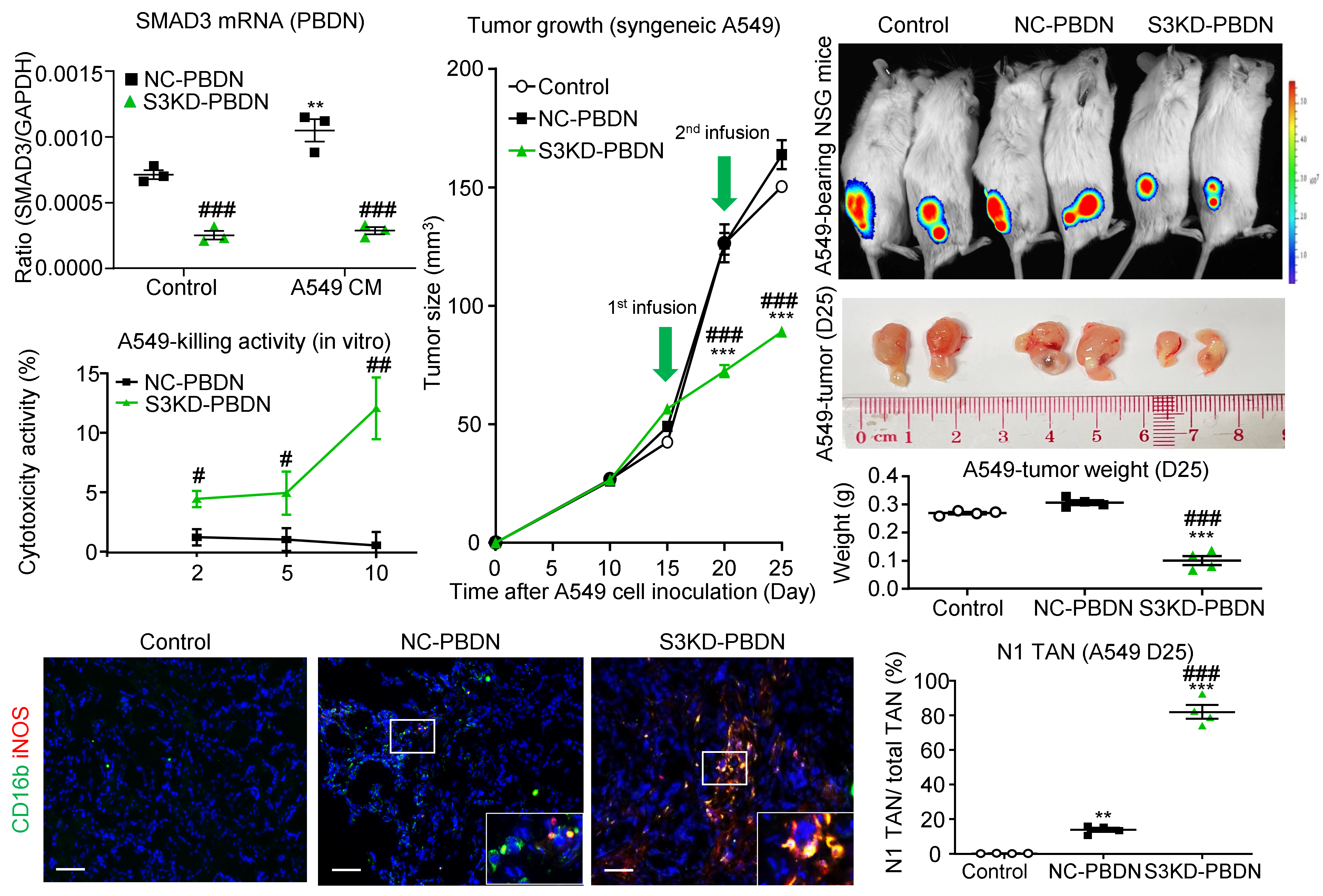 Unexpectedly, genetic deletion of Smad3 from the TME dramatically boosted up the N1 immunity in tumor and circulation of the mice with LLC (Figure 2). Importantly, adoptive transfer of the Smad3-silenced human peripheral blood derived neutrophils (PBDNs) effectively suppressed the growth of NSCLC A549 xenograft due to their enhanced N1 phenotypes and anticancer capacity in vivo (Figure 3), demonstrating its translational potential for lung cancer patients with primary or secondary drug resistance in clinic.