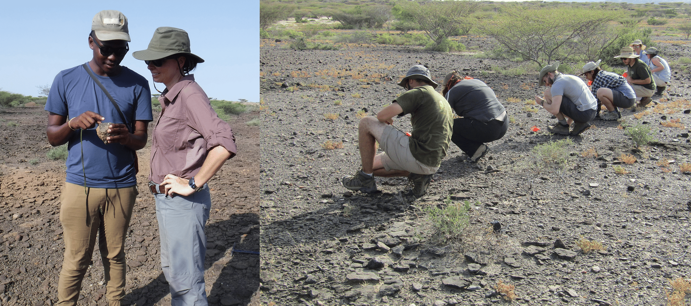 Figure 3. Co-author Silindokuhle Mavuso and I examine the sandstones (left), and students from the 2018 Koobi Fora Field School cohort perform a surface crawl at the KNM-ER 2598 site (right).