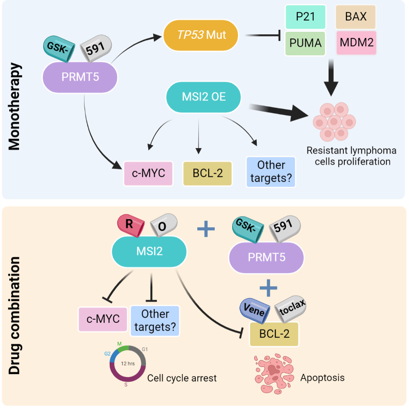 We found that of TP53 LOF and MSI2 expression could be used as biomarkers for patient stratification. Second, we propose two drug combination modalities, to overcome the resistance to PRMT5-targeted therapy with the BCL-2 inhibitor, venetoclax, and the MSI2 inhibitor, Ro. Both drug combinations induced potent anti-proliferative activity across different lymphoma subtypes.