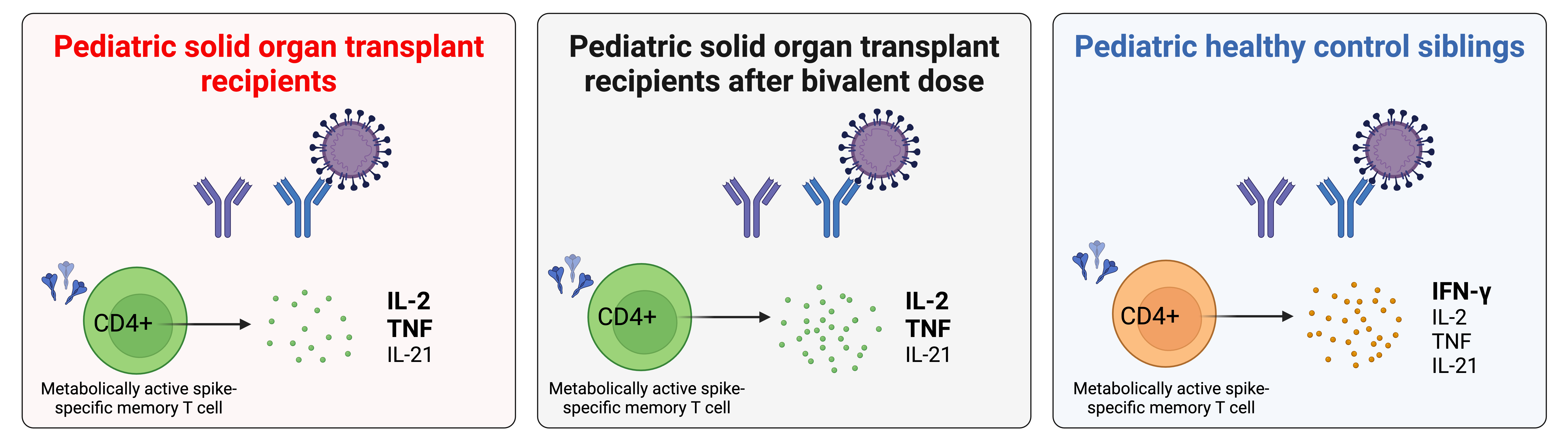 All groups showed similar antibody levels, but distinct T cell responses. Pediatric solid organ transplant recipients’ T cells mainly produce interleukin-2 (IL-2) and tumor necrosis factor (TNF), even after a bivalent dose, without increasing interferon-gamma (IFN-g), crucial for antiviral defense, as seen in healthy children.