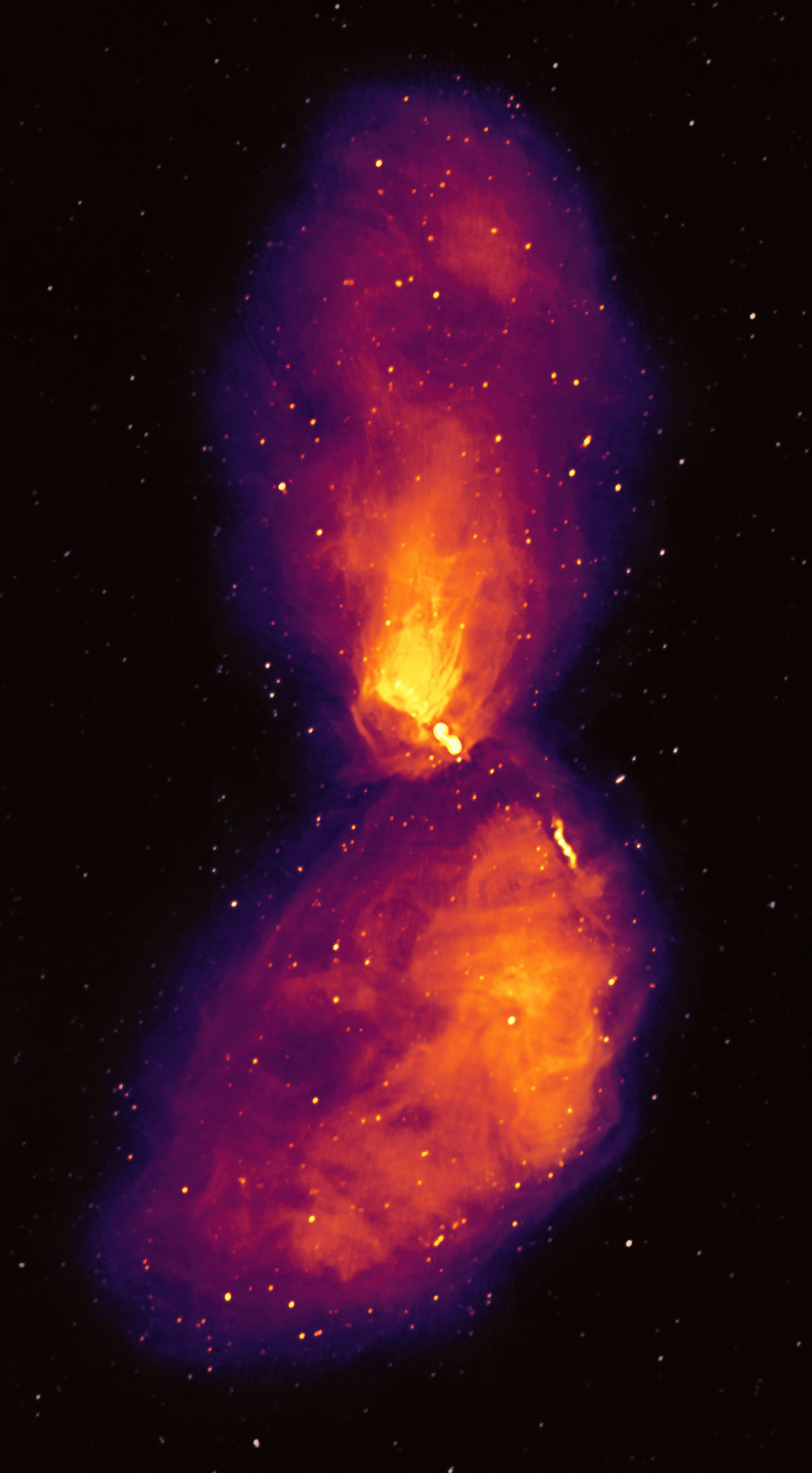 As I soon found out, the feedback of energy in radio galaxies has a strong influence on galaxy evolution and even very structure of the Universe itself. All galaxies are thought to harbour supermassive black holes at their centre; objects smaller than our Solar system that have masses millions of times larger than our Sun. In some galaxies these black holes are surrounded by a hot, swirling disk of matter that is being sucked in by the extreme gravitational pull. Only a small percentage of the in-falling mass actually makes it into the black hole, causing it to grow, while the rest is funnelled into narrow jets, which shine so brightly they can be observed tens of billions of lightyears away. The jets themselves can stretch out beyond the furthest stars in the galaxy, transporting mass and energy out into the space between galaxies. This intergalactic space is not empty, and as the jets pummel into it, they inflate bubbles, which appear in our radio telescopes as giant lobes like those we see in Centaurus A.