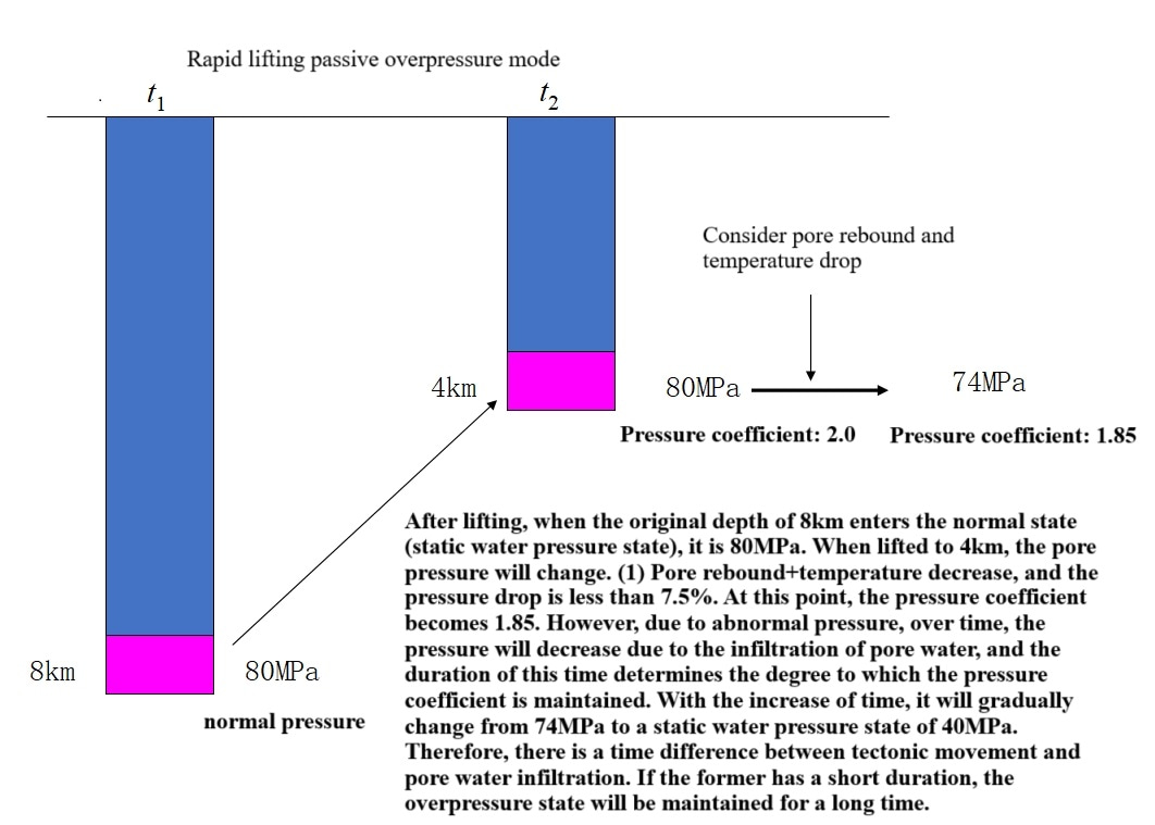 During recent rapid uplift events, such as Neogene-Quaternary exhumation, passive overpressure develops. Post-uplift, residual pore pressure persists in shallower strata, creating apparent overpressure when recalculated to new depths. For example, Well JY1 in the Sichuan Basin experienced rapid uplift, whereas Wells PY1 and LY1 (slow uplift) exhibit lower pressure coefficients. As illustrated in Fig. 3, pre-uplift strata at 8 km depth reached hydrostatic equilibrium (80 MPa pore pressure). Rapid exhumation to 4 km depth reduces pore pressure to ~74 MPa (due to pore rebound and temperature decrease), yielding a pressure coefficient of 1.85. However, subsequent pore fluid migration gradually dissipates this overpressure. The duration of this process determines pressure retention: rapid tectonic events (short time lag) preserve overpressure longer, while prolonged fluid equilibration reduces pressure coefficients toward hydrostatic values (e.g., 40 MPa). This temporal decoupling between tectonic uplift and fluid permeation explains persistent overpressure anomalies.
