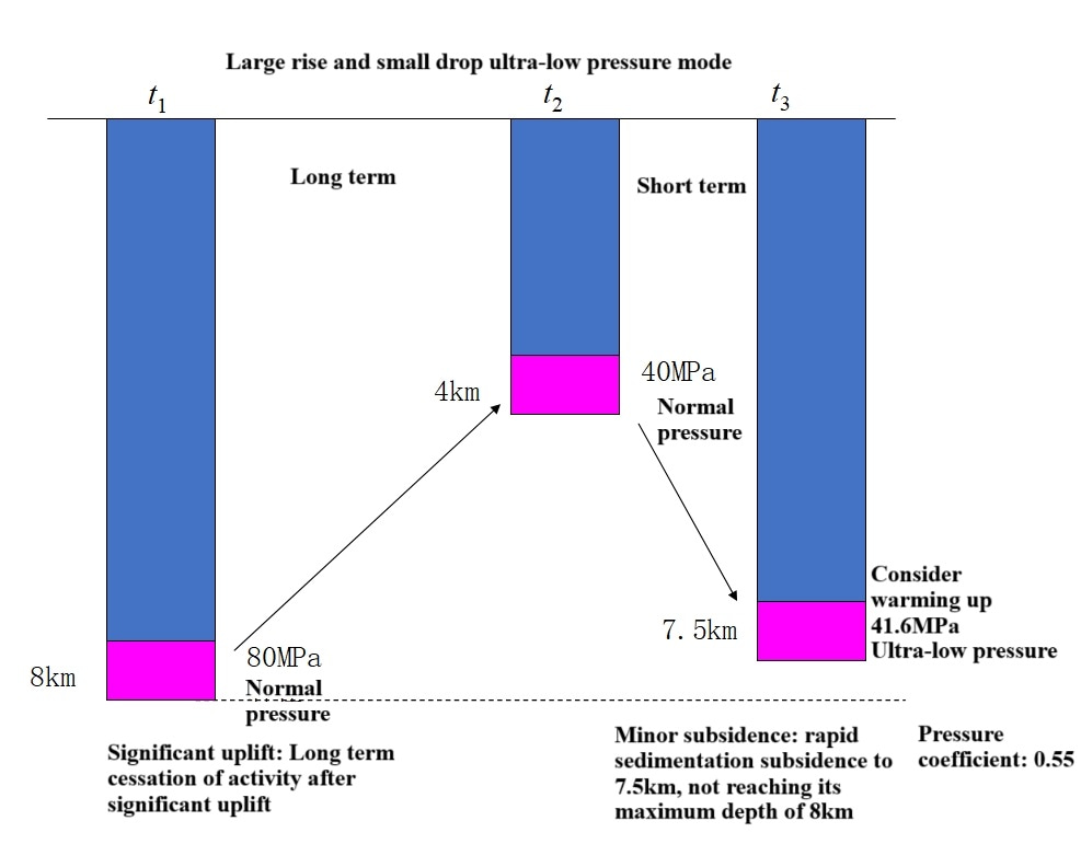 Prolonged substantial uplift to significant elevations, followed by rapid minor subsidence that does not reach prior maximum burial depths, generates extreme underpressure. Extended residence at high elevations fully dissipates abnormal pore pressures, maintaining hydrostatic conditions. Subsequent minor subsidence halts diagenesis, preserving original porosity and pressure. When recalculated to new depths, this static pressure regime manifests as extreme underpressure because insufficient time exists for fluid re-equilibration or pore water replenishment. Fig. 4 illustrates this mechanism: rapid descent to shallow depths without achieving maximum burial depth traps underpressured conditions.