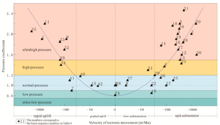 Fig. 2 illustrates the correlation between recent tectonic movement rates (positive for subsidence, negative for uplift) and pressure coefficients across multiple global basins. A consistent positive relationship is observed: faster recent tectonic activity (whether uplift or subsidence) correlates with higher pressure coefficients. No exceptions have been identified to date.