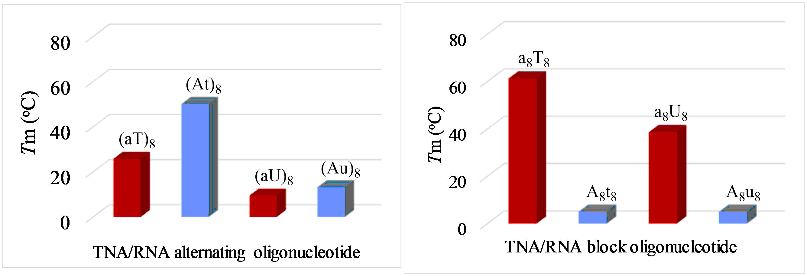 Figure. 2 Comparison of UV-Tm values of duplexes of alternating TNA-RNA chimeric sequences (left) and block TNA-RNA chimeric sequences (right) in 1M NaCl, 10 mM Na2HPO4, 100 µM EDTA of pH 7.2; a,t,u = TNA and A,T,U = RNA