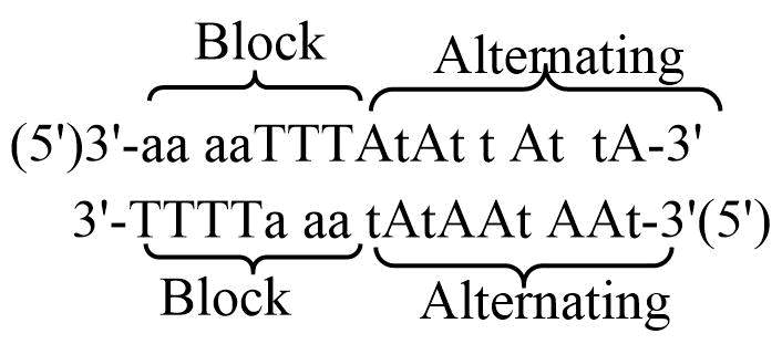 These observations suggested that the non-self complementary sequences containing RNA-pyrimidine with TNA-purine in a block pattern could be combined with TNA-pyrimidine and RNA-purine at alternating positions may give rise to form strong chimeric base-pairing systems. Based on this hypothesis, two complementary strands were designed in such a way that the block portion of the chimeric sequence contains RNA(T) and TNA(a), while the alternating portion of the chimeric sequence contains TNA(t) and RNA(A).