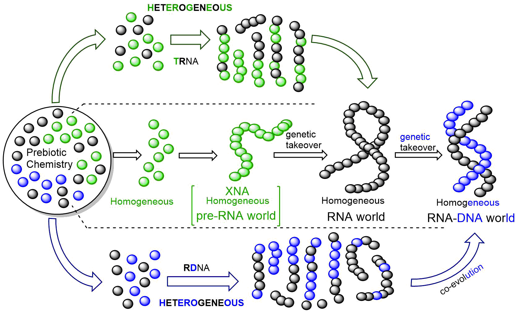 DNA, RNA, and proteins are central to the current life on Earth where they play the genotypic, phenotypic and catalytic role respectively. But how did these biopolymers arise before biology? The RNA world hypothesis postulates RNA to be the first genetic polymer and protein and DNA are its later descendants. Hence, most of the efforts have been guided by the desire of a clean prebiotic synthesis of RNA (or pre-RNA molecule, which later converted to RNA). However, various studies indicate that other nucleic acids, such as DNA and other pre-RNA molecules (like TNA) could have been available simultaneously on early Earth. Therefore, besides forming their respective homogeneous polymers, the other nucleic acids could also become part of the other polymers and make hybrid (chimeric) sequences as well. Such kind of chimeric sequences, due to the (mis)incorporation of rNMP into DNA by DNA polymerase, is observed even in modern biology.1-2 And to repair such misincorporations, sophisticated proof-reading enzymes have been invented. But in prebiotic era there were no such sophisticated enzymes. Hence, the existence of such hybrid sequences (heterogeneity) in the early Earth would have been more realistic. So, what were the roles of those chimeric polymers in the evolution of homogeneous nucleic acids? Did they help or interfere, or were they bystanders, in the emergence of RNA and DNA?