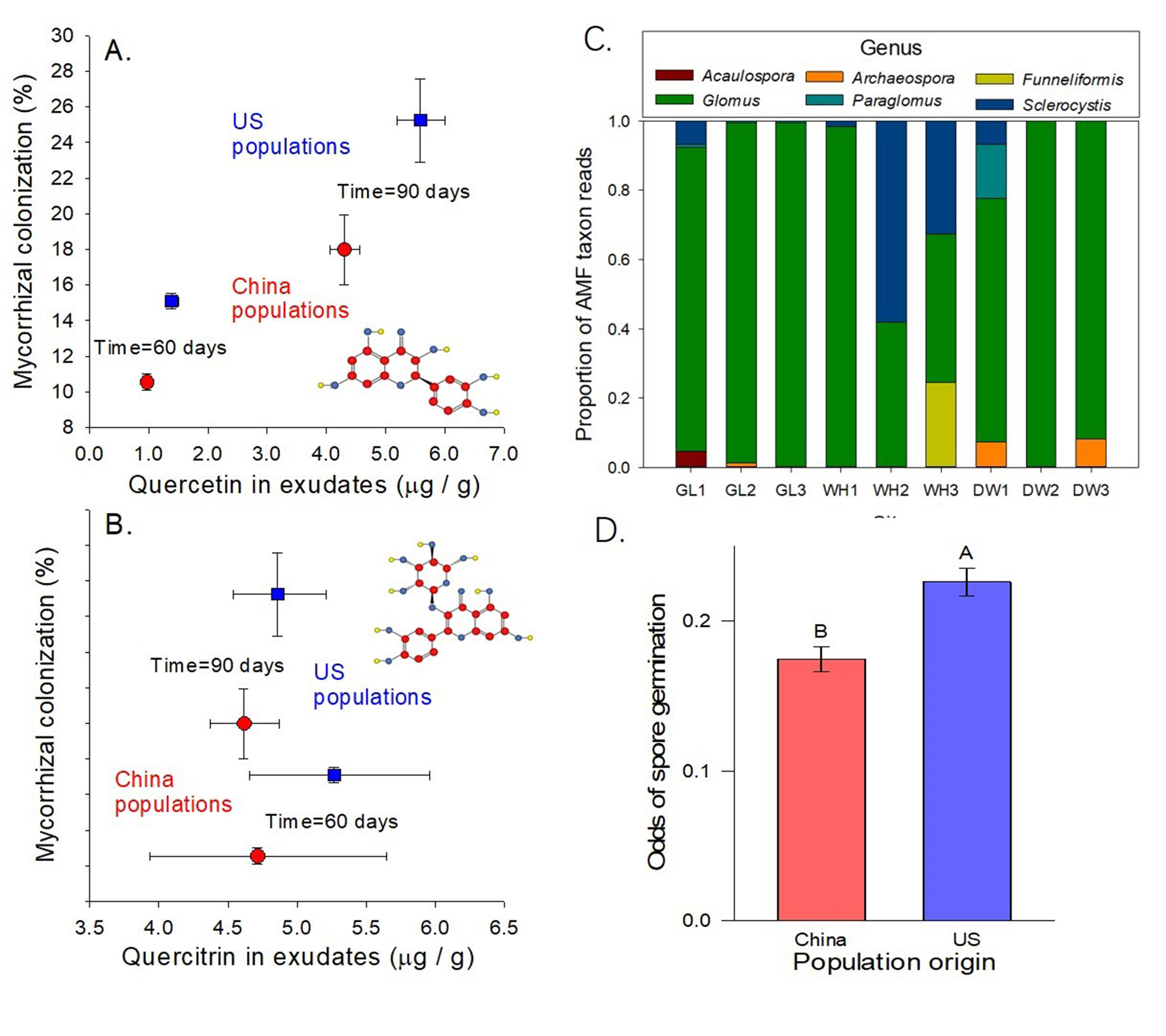 In this study, our team found that invasive populations of Chinese tallow tree (Triadica sebifera) could establish stronger symbiotic relationships (higher AM fungal colonization and more plant biomass) by comparing the relationships between AM fungi on tallow tree seedlings from invasive (US) and native populations (China) in common gardens. First, we found that the concentration of flavonoids (quercetin and quercitrin) in root exudates of plants from invasive populations were higher than those from native populations (Fig. 1 A&B). Because quercetin and quercitrin are known to be important chemical signals that can stimulate AM fungal colonization, this implies that the changes in flavonoids in root exudates play a strong role in the interaction between plants and AM fungi. Second, adding the root exudate from invasive populations more strongly promoted development of AM fungi compared to those from native populations. Third, experimental inactivation of root exudate chemicals (including flavonoids) reduced associations between AM fungi and invasive plants indicating an important role for such chemicals. Finally, to test the role of root exudate flavonoids, experimental additions of quercetin increased AM fungal spores’ germination and root colonization (Fig. 1 C&D). Together these experiments are strong evidence that a higher concentration of quercetin in root exudates plays an important role in the higher AM fungal colonization of plants from invasive populations. This research not only clarified the mechanisms underlying the "Enhanced Mutualisms Hypothesis", an important proposed explanation of the success of invasive plants, but also provides new insights into the effect of root exudates on the interactions between plant and soil microbes. This research was funded by the National Key Research and Development Project (YFCF20171200100) and the National Natural Science Foundation of China (31971558, 31770414, 31600300).