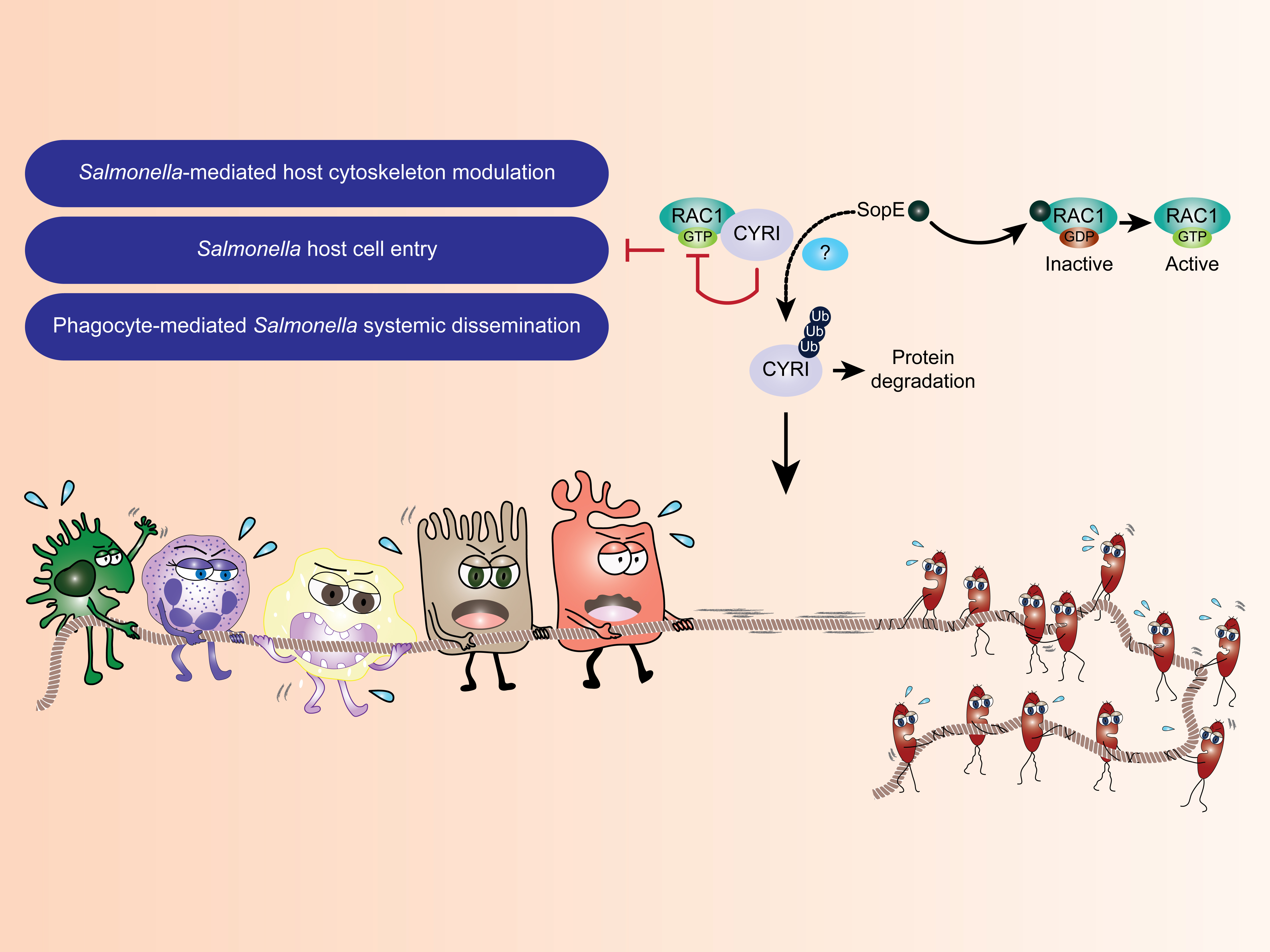 By adopting a multi-disciplinary approach we were indeed able to uncover an uncharacterised role of a host protein, FAM49B, which we named CYRI (CYFIP-related RAC1 Interacting protein), in conferring resistance against Salmonella infection. We show that CYRI binds to the small GTPase RAC1, an important regulator of actin cytoskeleton dynamics and cell migration. Interestingly, it has long been shown that Salmonella manipulates host cytoskeletal regulators, including RAC1, to promote infection. For example, the bacterial effector SopE is known to activate RAC1 at early stages of infection to facilitate bacterial entry into non-phagocytic cells. In this study, we show a new aspect of this interplay. In particular, we identify CYRI as a negative regulator of RAC1 downstream signalling with CYRI inhibiting cytoskeletal modulation and cell migration. As such, CYRI counteracts Salmonella at various stages of infection, including bacterial entry and dissemination. As a counterdefence, SopE, in addition to activating RAC1, also selectively targets CYRI upon infection via reducing its cellular levels. Together, this places CYRI at the heart of the host-Salmonella tug of war, suggesting that CYRI protein levels are an important determinate of bacterial fate.