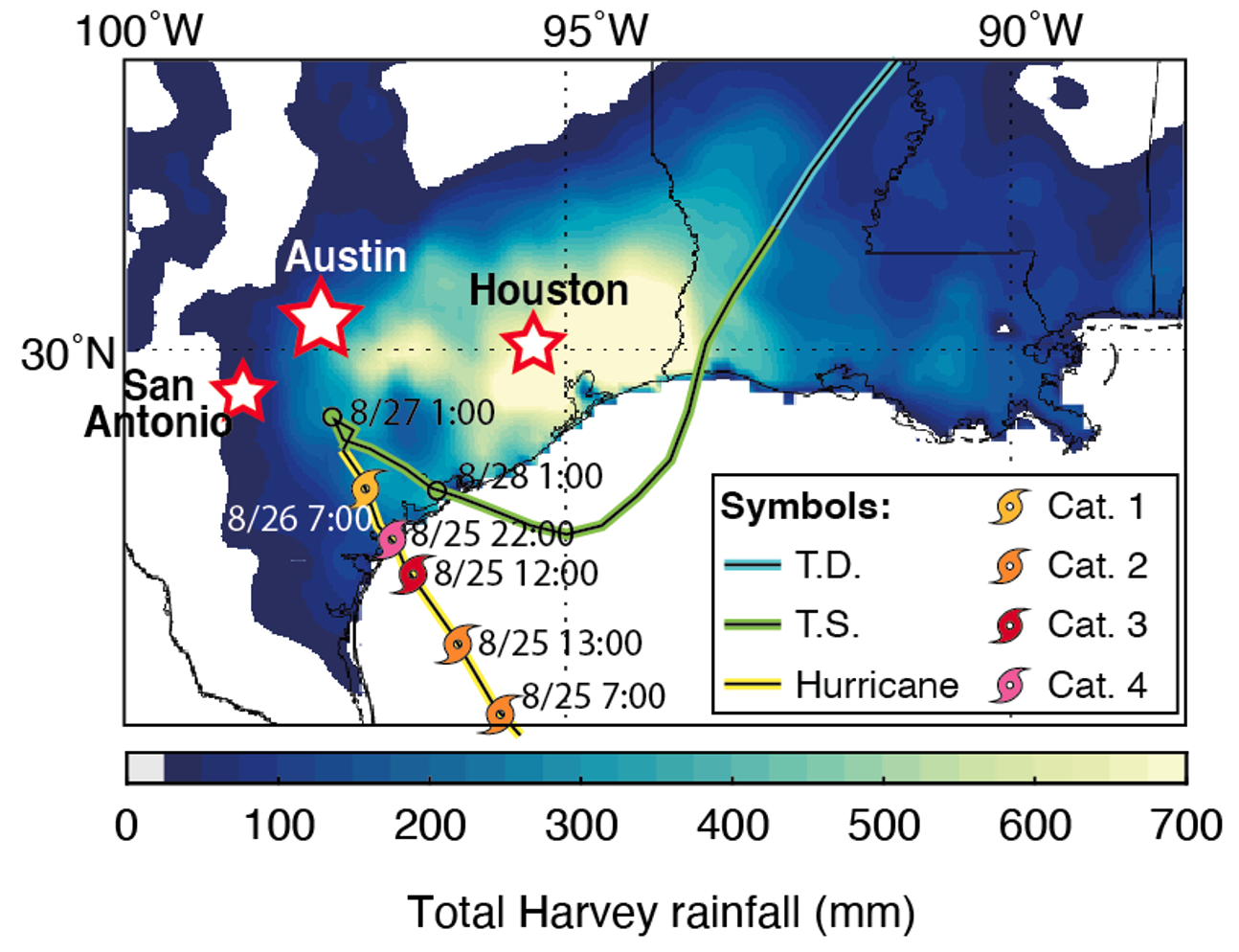 During the extremely active 2017 Atlantic hurricane season, three landfalling major hurricanes made devastating impacts (Harvey, Irma, and Maria) to the southern United States and the Caribbean. Among them, Hurricane Harvey set the record for both total rainfall and affected area in the US history (Figure 1). However, Hurricane Harvey also provided us with a great opportunity to study the isotopic variability of tropical cyclone precipitation at exceptionally high resolution. Researchers from the Jackson School of Geosciences at The University ofTexas at Austin and the Department of Earth and Planetary Sciences at The University of Texas at San Antonio collaborated to collect Hurricane Harvey precipitation simultaneously in Austin, San Antonio, and Houston throughout the storm. To our knowledge, such a systematic rainwater collection campaign during a tropical cyclone is unprecedented, and as a result, provides unique insights into the controls on the isotopic composition of precipitation during a tropical cyclone event.