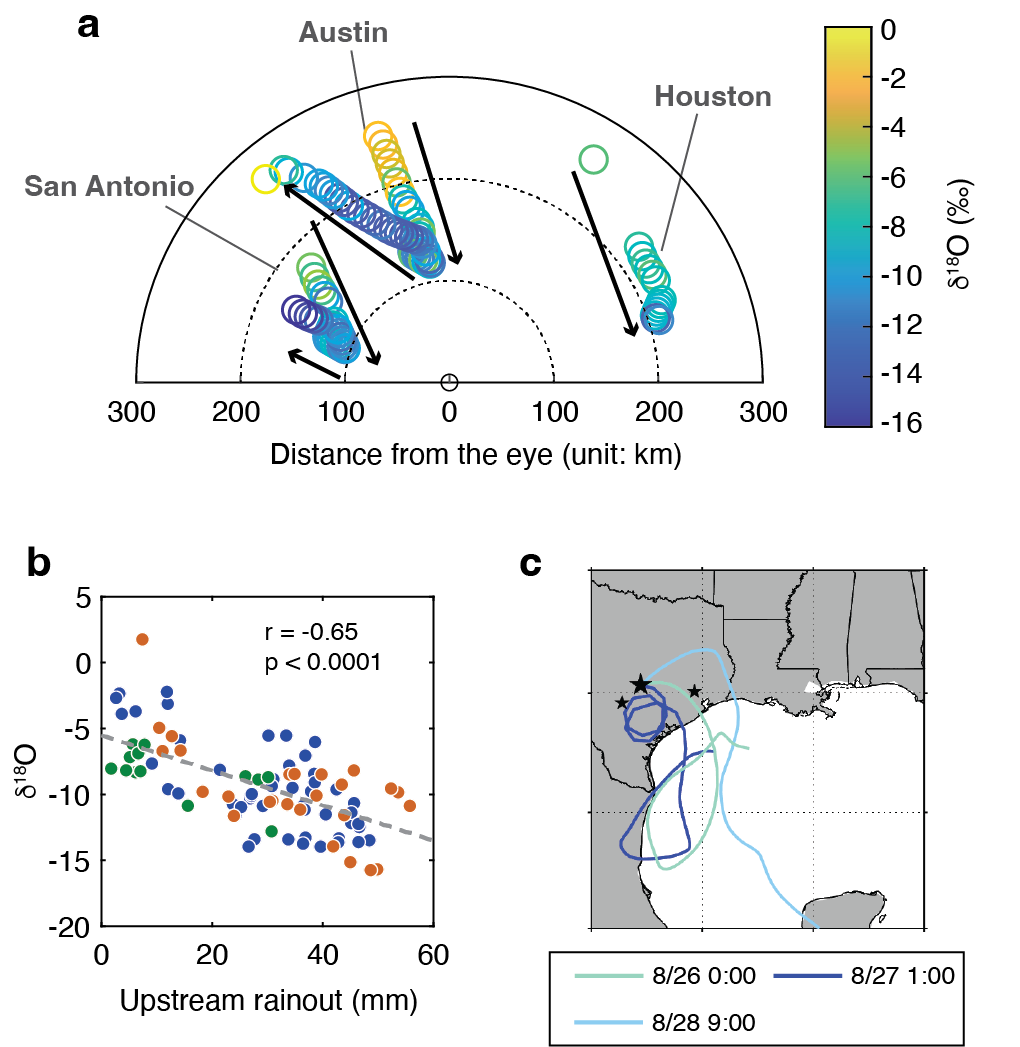 How do changes in the moisture transport pathway impact the δ18O and δ2H of rainwater? We found that near-eyewall air parcels that orbited around the hurricane eye had experienced more total amount of rainout, which led to isotopic depletion due to the “Rayleigh distillation” effect. In this theory, because heavier isotopologues (1H2H16O and 1H218O) condensates faster than the light isotopologue (1H216O), 2H and 18O are preferentially removed from the water vapor, leading to gradual depletion of these heavy isotopes in the remaining water vapor. When such isotopically depleted water vapor was transported to our sampling sites, the resulting rainwater would also have more negative isotopic values. Therefore, the closer we are to the center of the tropical cyclone, the more the vapor-bearing airmass has experienced rainout, and the more negative the isotopic values of rainwater are (Figure 2b). We further found that the control of upstream rainout on isotopic variability is robust in many other previously reported datasets of tropical cyclone precipitation, though future studies need to investigate the interplay of the isotope-enriching effect of post-condensation re-evaporation and upstream rainout.