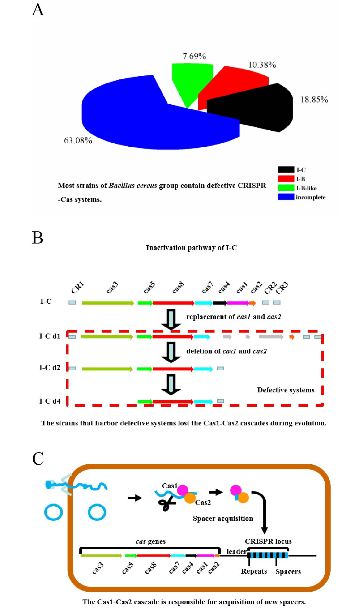 Fig 1. The inactivation phenomenon and pattern of CRISPR-Cas systems in B. cereus group strains. (A) Proportion of B. cereus group strains with intact or defective CRISPR-Cas systems. (B) The proposed inactivation pathways of subtype I-C CRISPR-Cas systems. (C) The schematic diagram of Cas1-Cas2 cascade for acquisition of new spacers from MGEs, such as phages and plasmids. Fig 1A and 1B are modified versions of Fig. 1C and Fig. 2C within the published paper, respectively.